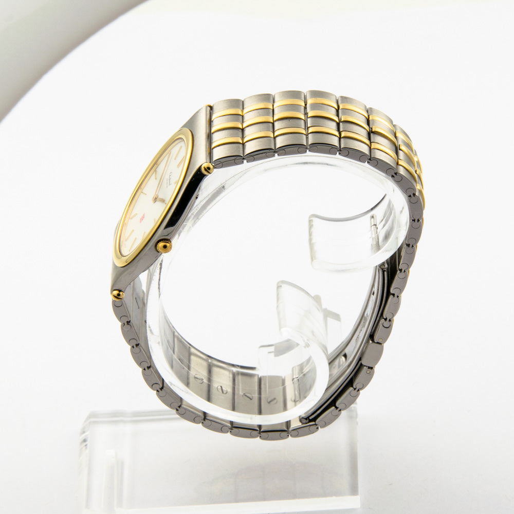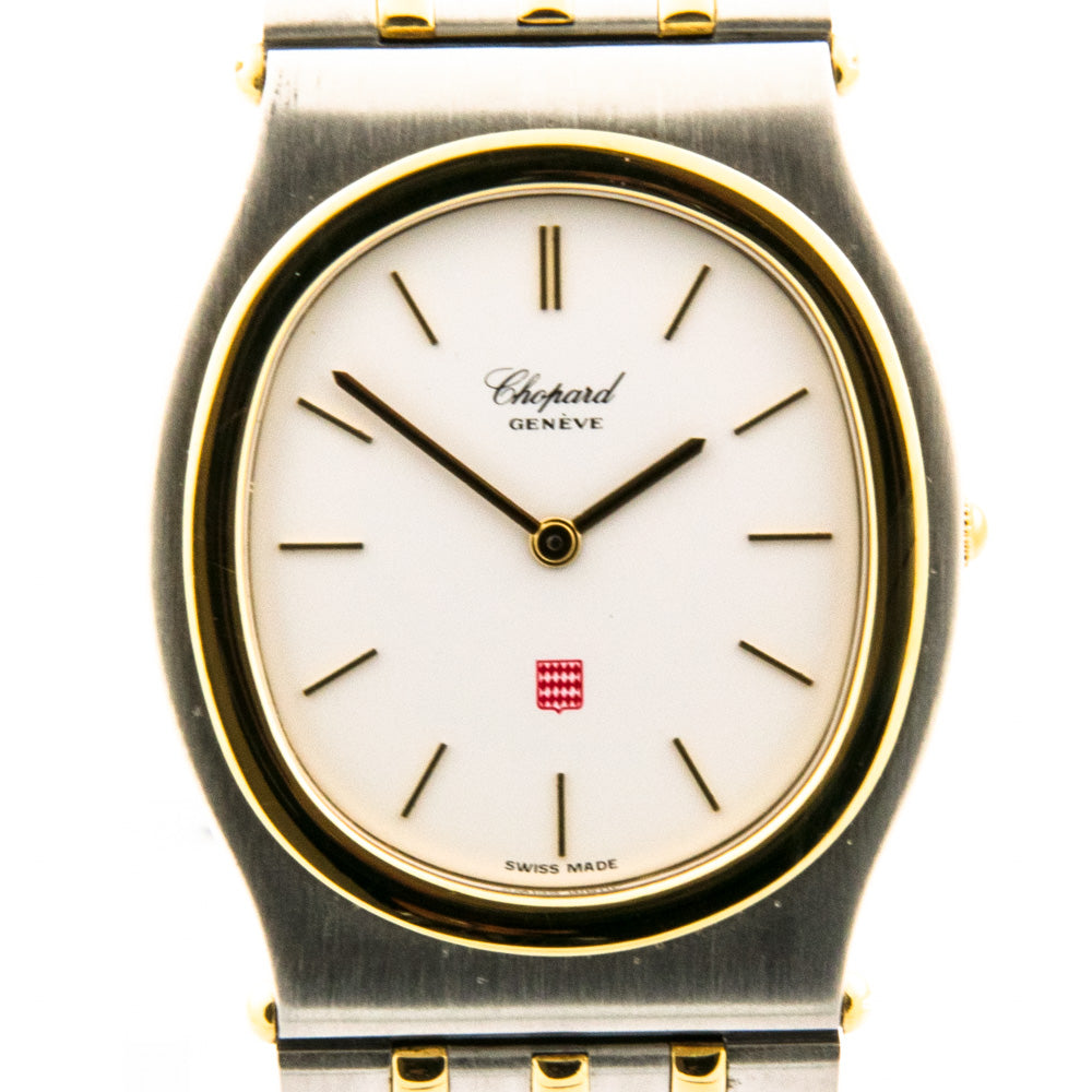Bei dem Schmuckstück handelt es sich um eine Herrenarmbanduhr der Marke Chopard Modell "Monte-Carlo" mit der Referenznummer 318035-4002. Das Material der Uhr ist 750 Gelbgold/Edelstahl. Sie besitzt ein Quarzwerk. Es erfolgte eine Revision durch Chopard.