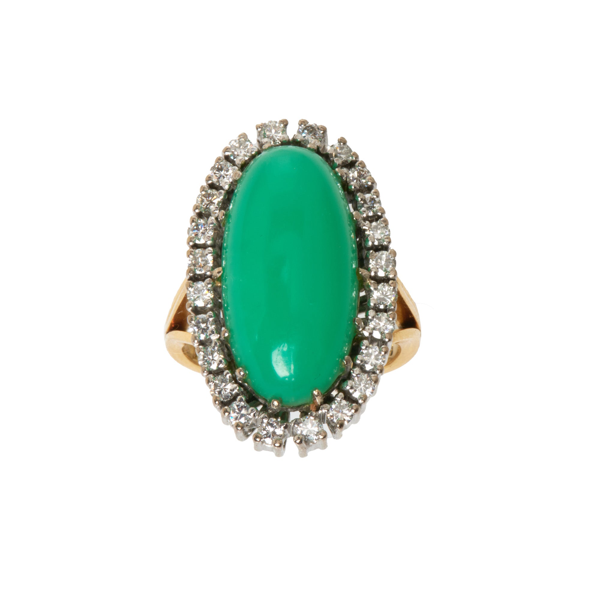 Bei dem Schmuckstück handelt es sich um einen in Handarbeit gefertigten Ring aus 750 Gelb- und Weißgold mit einem Chrysoprascabochon und 24 Brillanten von zusammen ca. 0,72 ct in der Qualität Weiß mit kleinen Einschlüssen (W/si).