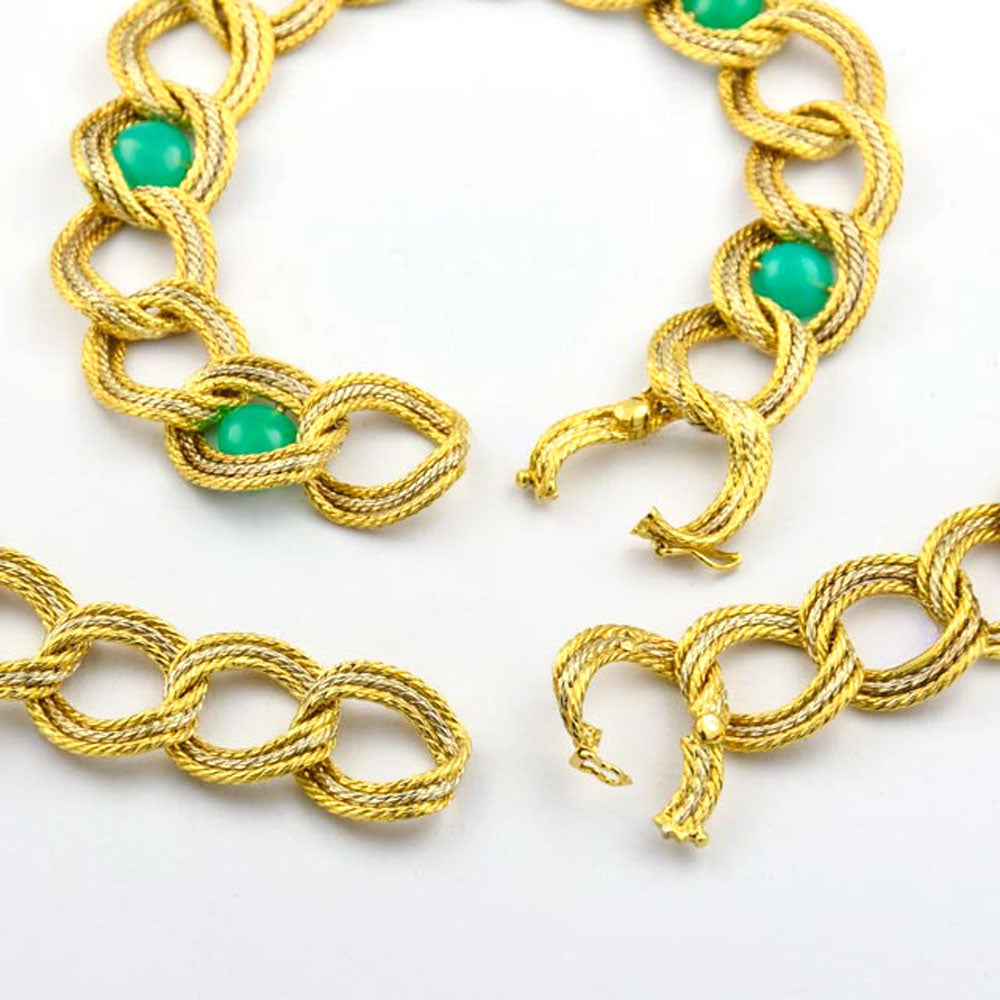 Bei dem Schmuckstück handelt es sich um ein Schmuckset aus Halskette und Armband aus 750 Gelb- und Weißgold mit zwölf Chrysoprasen.