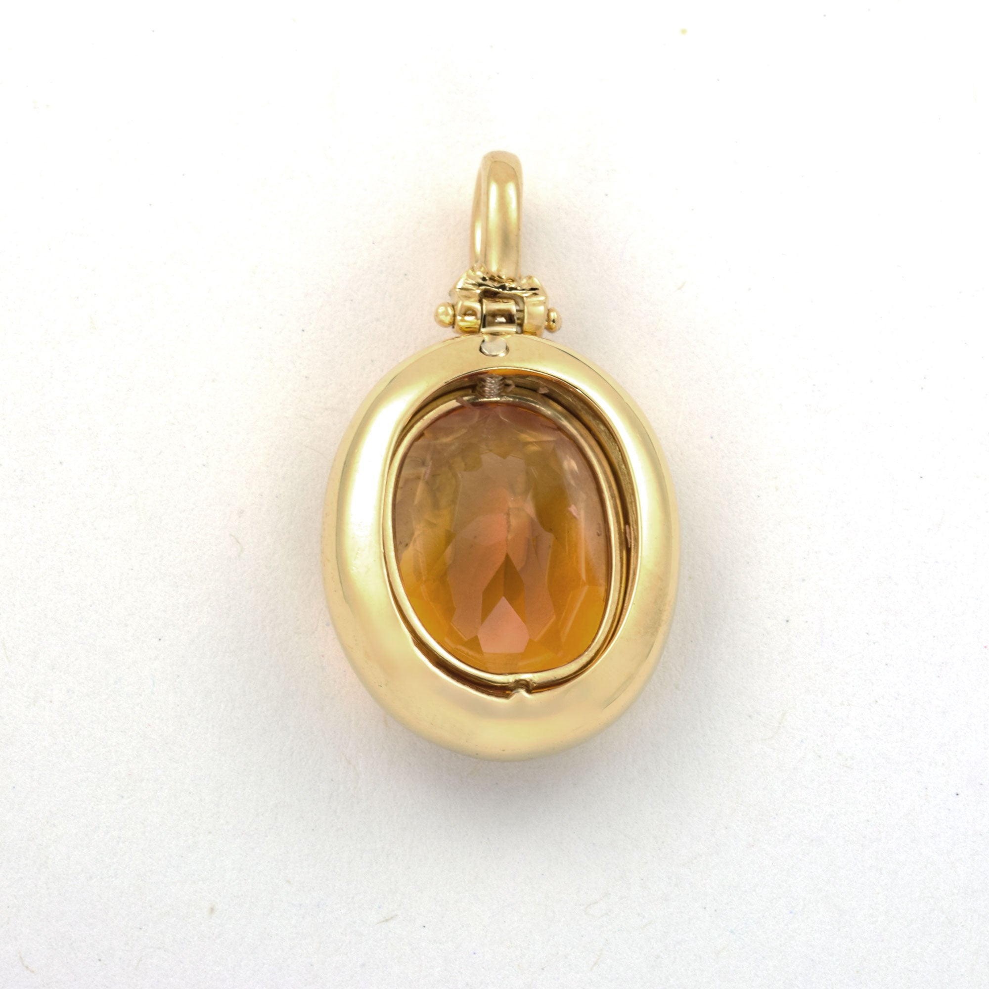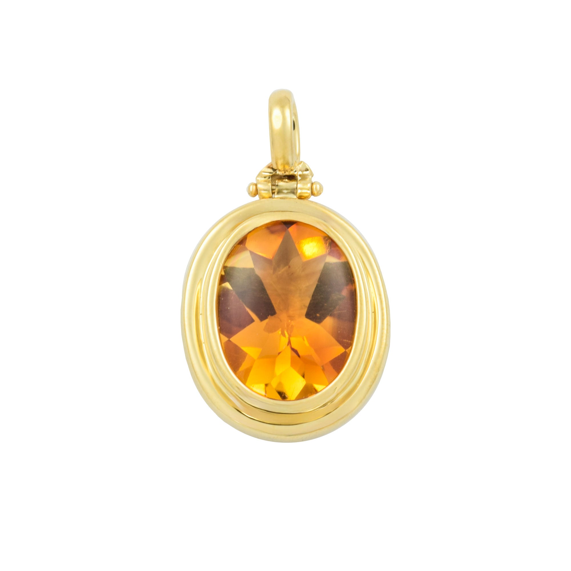 Bei dem Schmuckstück handelt es sich um einen Anhänger aus 750 Gelbgold mit einem Citrin im Bufftopschliff.