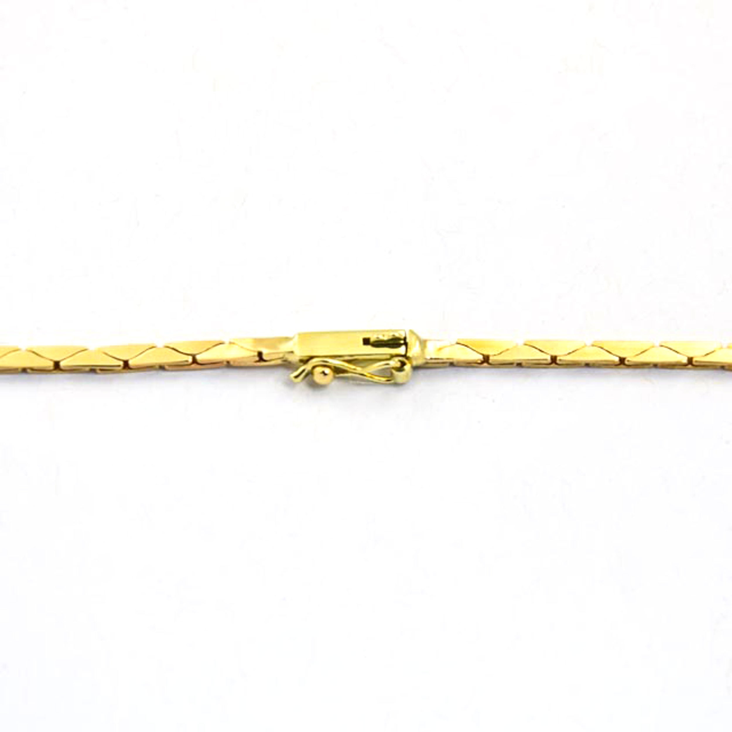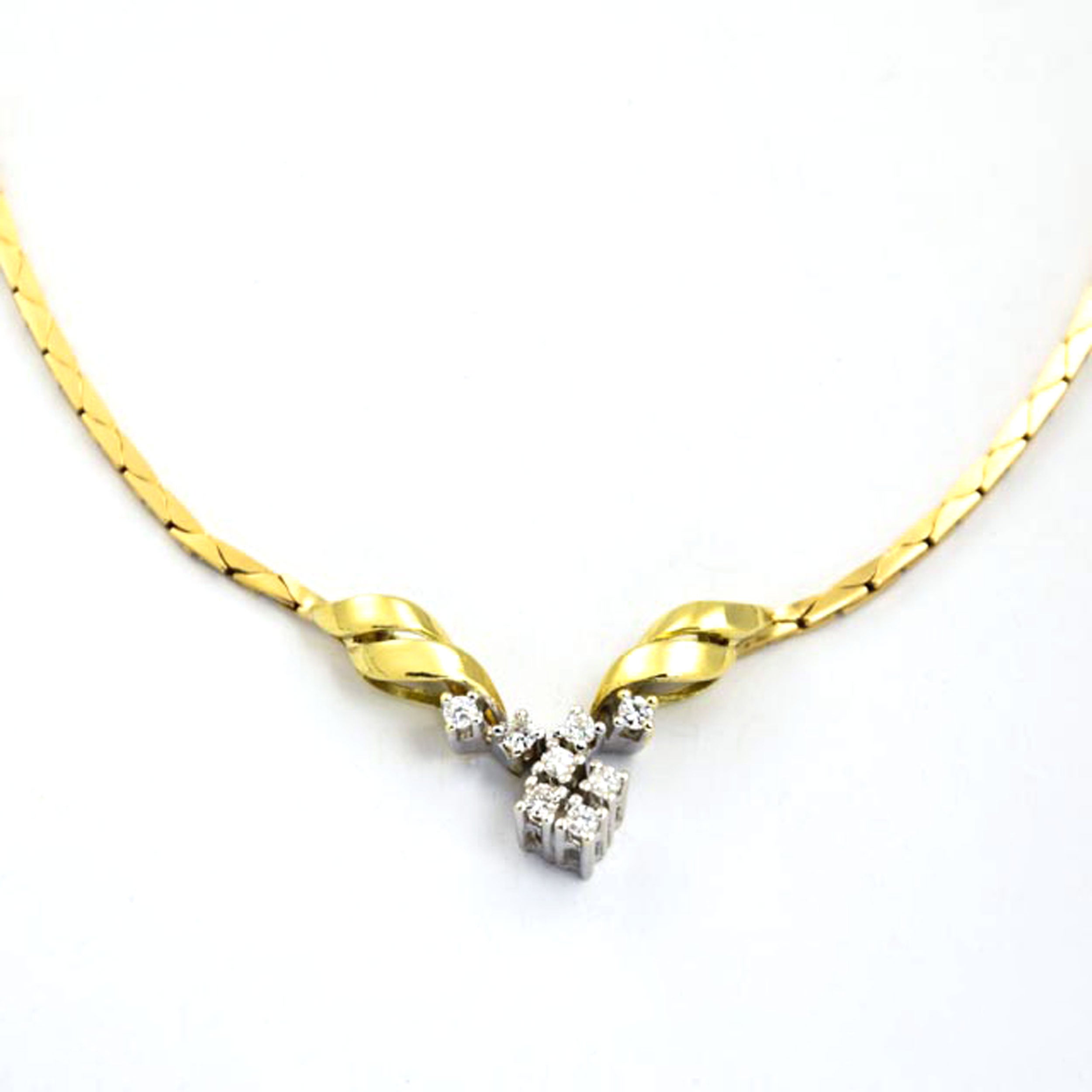 Bei dem Schmuckstück handelt es sich um ein Collier aus 585 Gelb- und Weißgold mit acht Brillanten von zusammen ca. 0,22 ct in der Qualität Weiß mit kleinen Einschlüssen (W/si). Das Schmuckstück hat eine Gesamtlänge von 40cm.