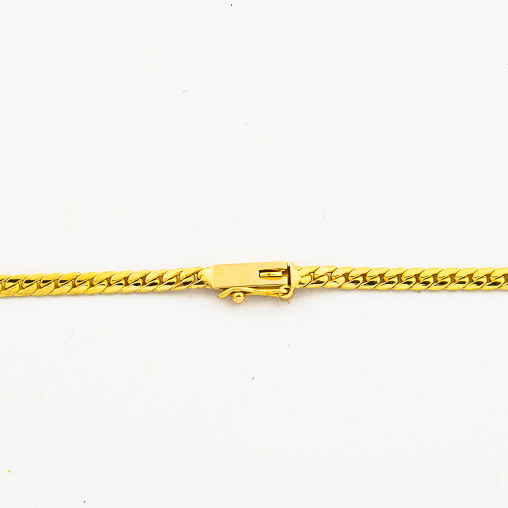 Bei dem Schmuckstück handelt es sich um ein Collier aus 585 Gelb- und Weißgold mit vier Diamanten im 8/8 Schliff von zusammen ca. 0,03 ct in der Qualität Weiß mit kleinen Einschlüssen (W/si). Das Schmuckstück hat eine Gesamtlänge von 40 cm.