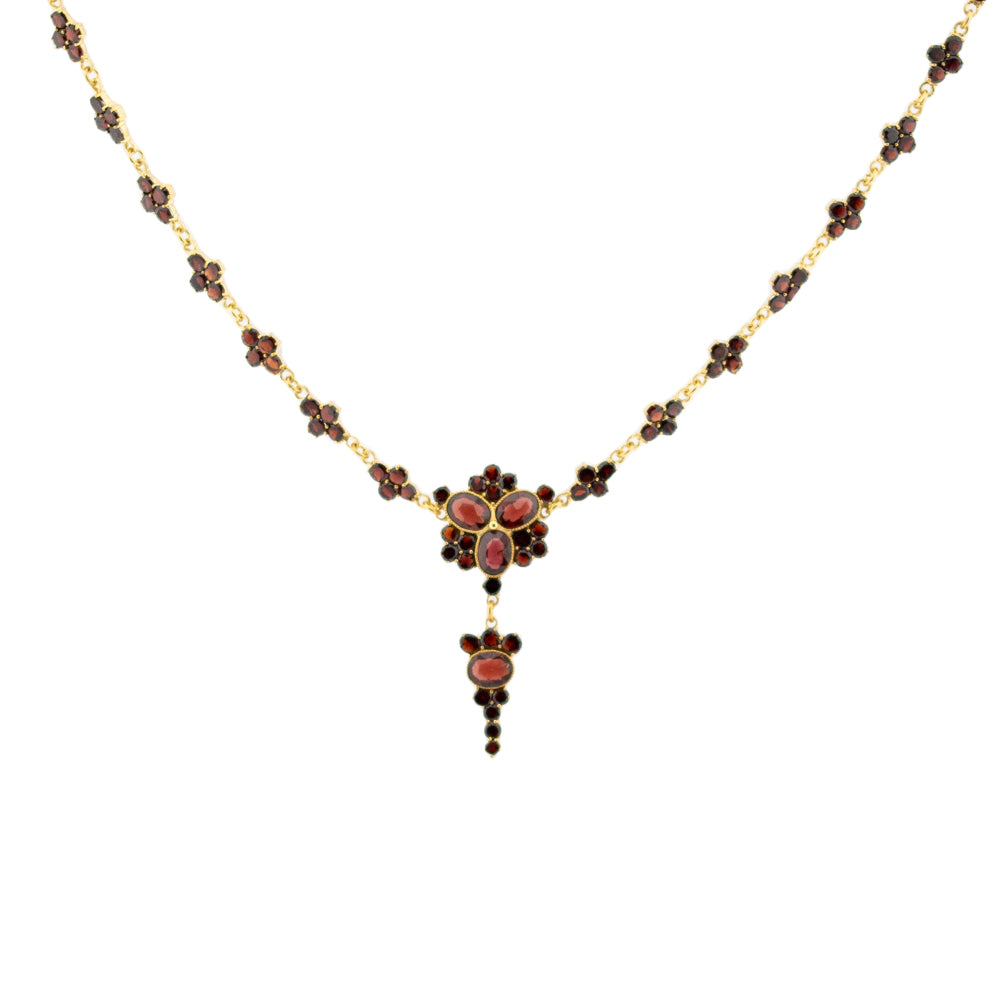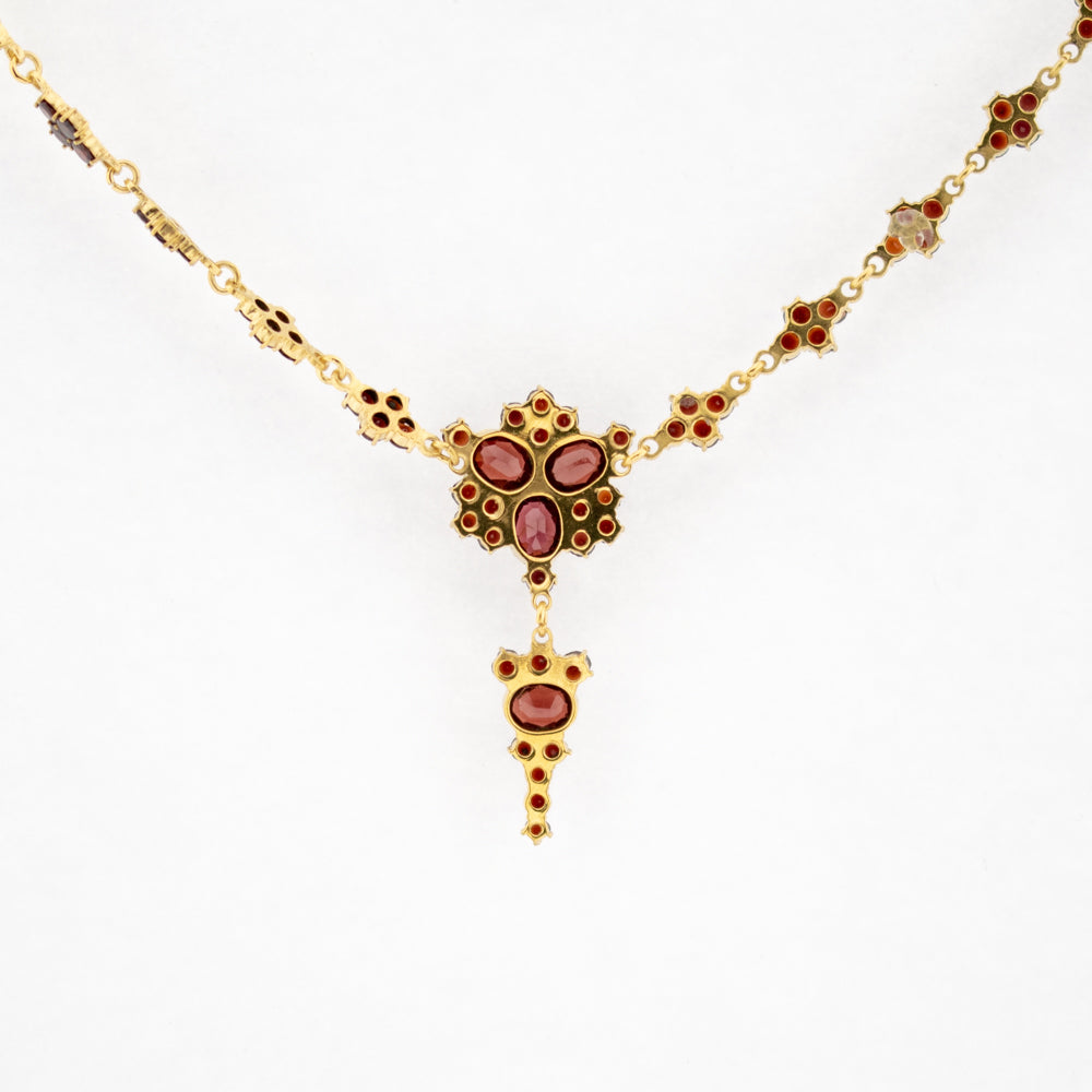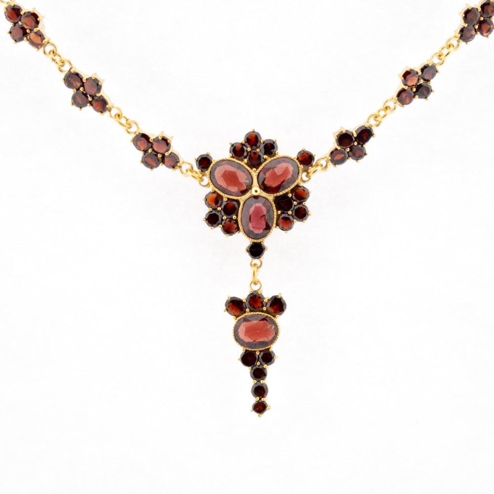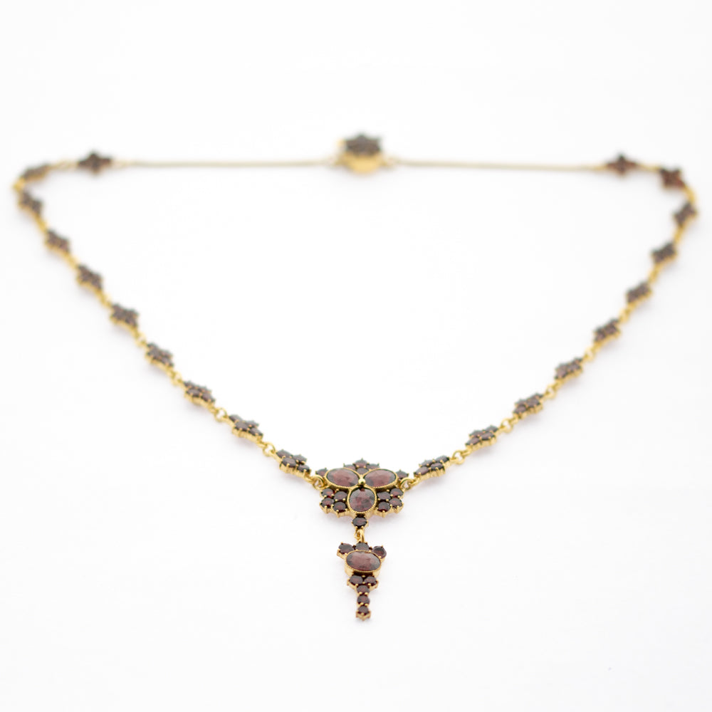 Bei dem Schmuckstück handelt es sich um ein Collier aus Metall mit Granaten aus den 1940er Jahren. Das Schmuckstück hat eine Gesamtlänge von 39,5 cm.