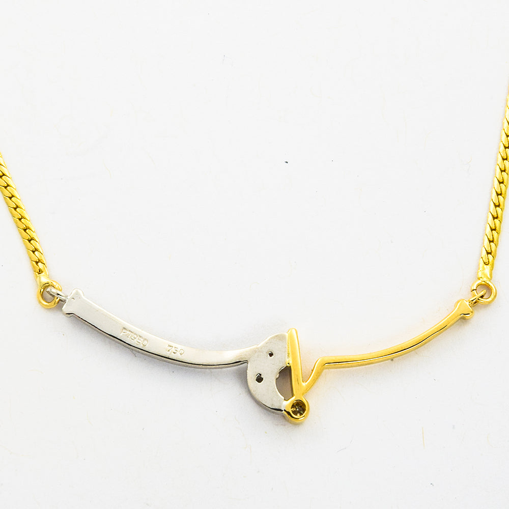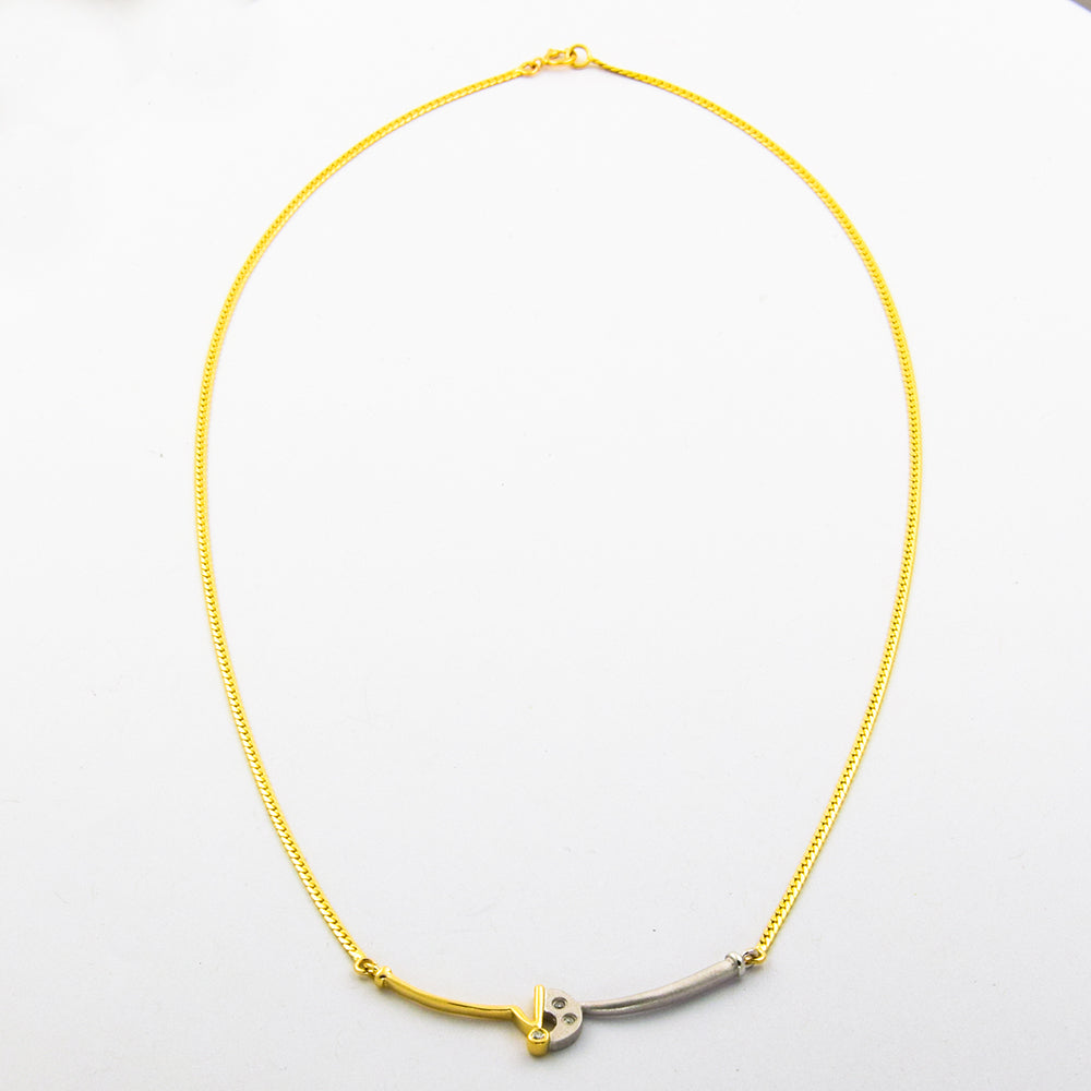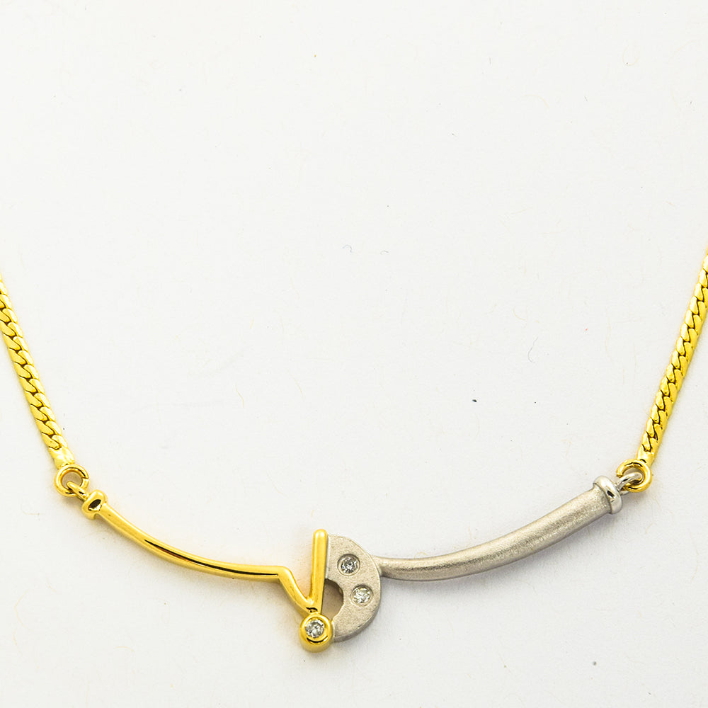 Bei dem Schmuckstück handelt es sich um ein Collier aus 950 Platin/750 Gelbgold mit drei Brillanten von zusammen ca. 0,03 ct in der Qualität Weiß mit kleinen Einschlüssen (W/si). Das Schmuckstück hat eine Gesamtlänge von 45,5 cm.