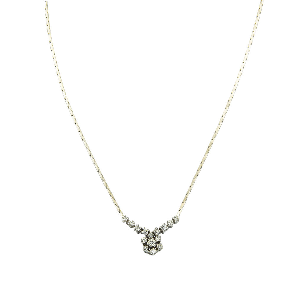 Bei dem Schmuckstück handelt es sich um ein Collier aus 585 Weißgold mit 15 Brillanten von zusammen ca. 0,29 ct in der Qualität Weiß mit kleinen Einschlüssen (W/si). Das Schmuckstück hat eine Gesamtlänge von 40 cm.