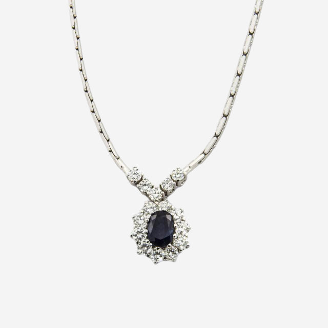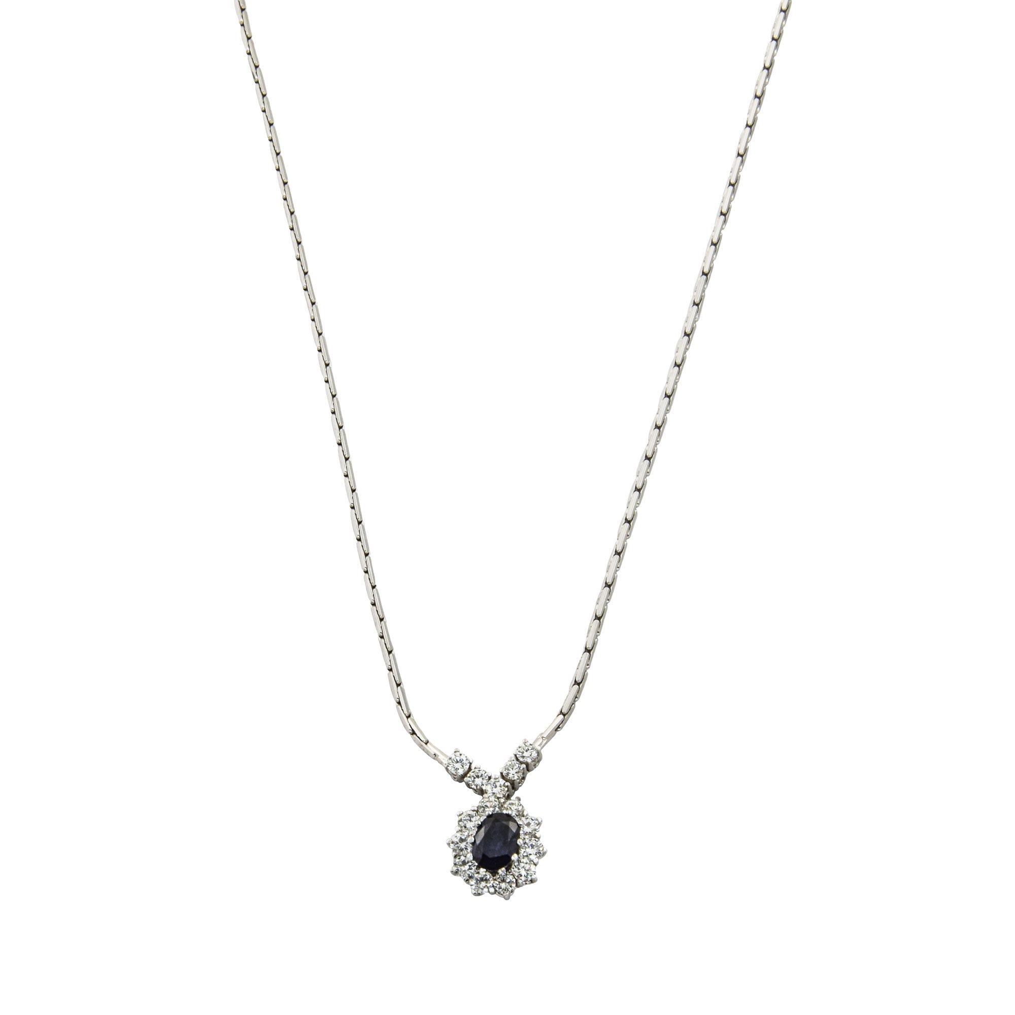 Bei dem Schmuckstück handelt es sich um ein Collier aus 585 Weißgold mit einem Saphir und 15 Brillanten von zusammen ca. 0,75 ct in der Qualität Weiß mit kleinen Einschlüssen (W/si). Das Schmuckstück hat eine Gesamtlänge von 43 cm.