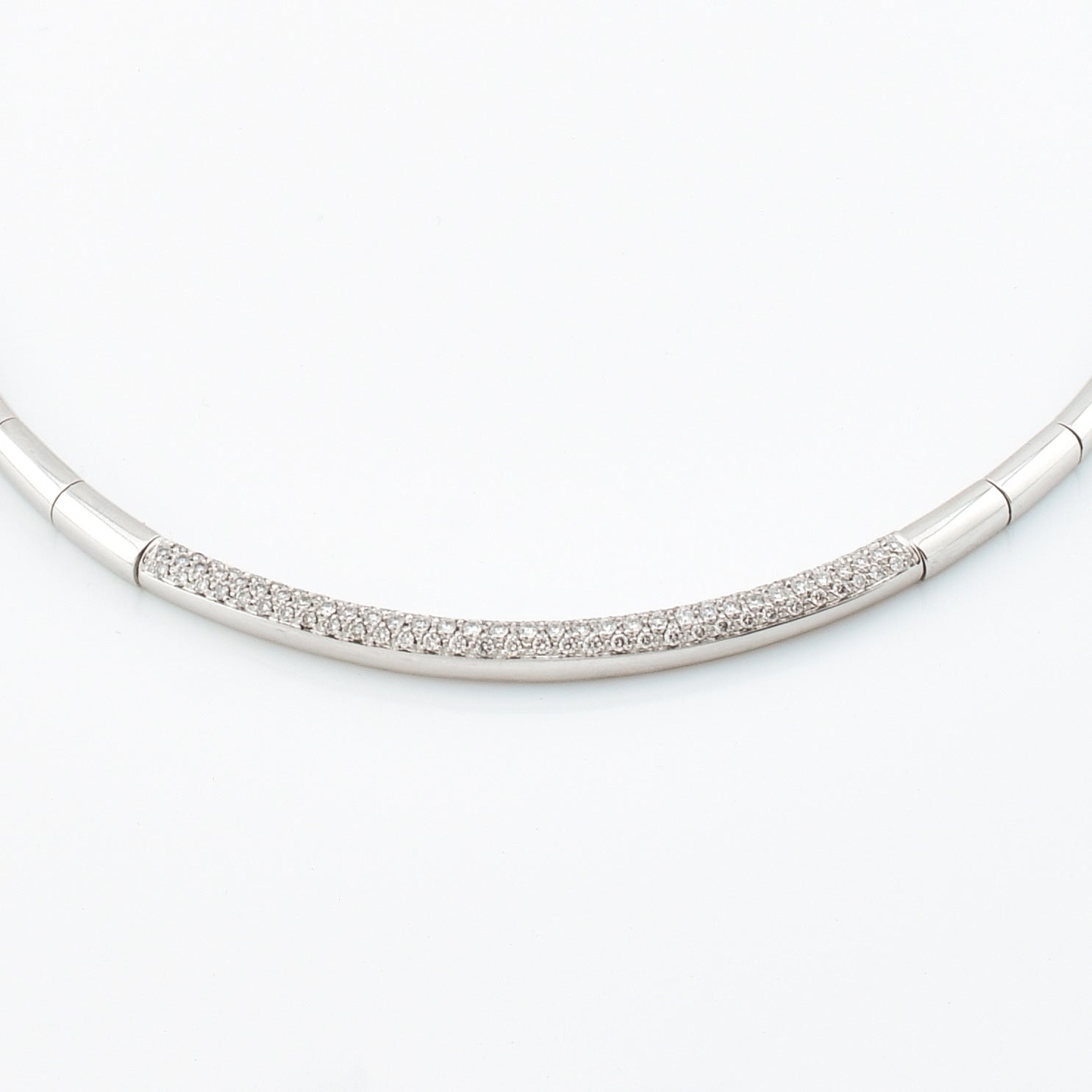 Bei dem Schmuckstück handelt es sich um ein Collier der Marke Leo Pizzo aus 750 Weißgold mit 97 Brillanten von zusammen ca. 1,455 ct in der Qualität feines Weiß mit sehr kleinen Einschlüssen (TW/vs). Das Schmuckstück hat eine Gesamtlänge von 40 cm.