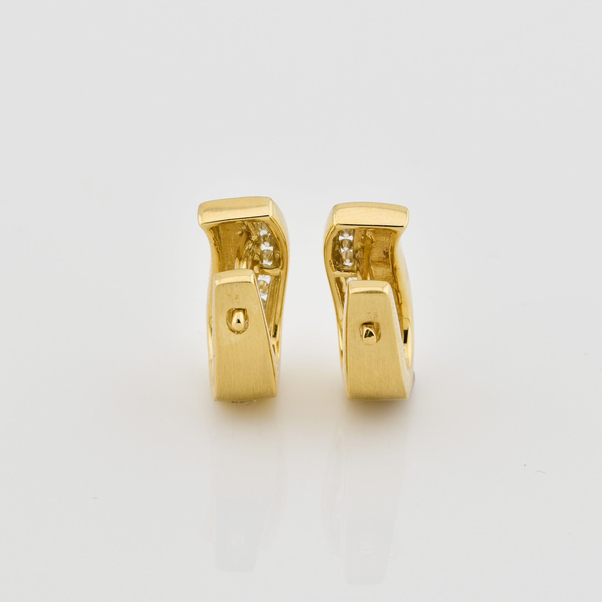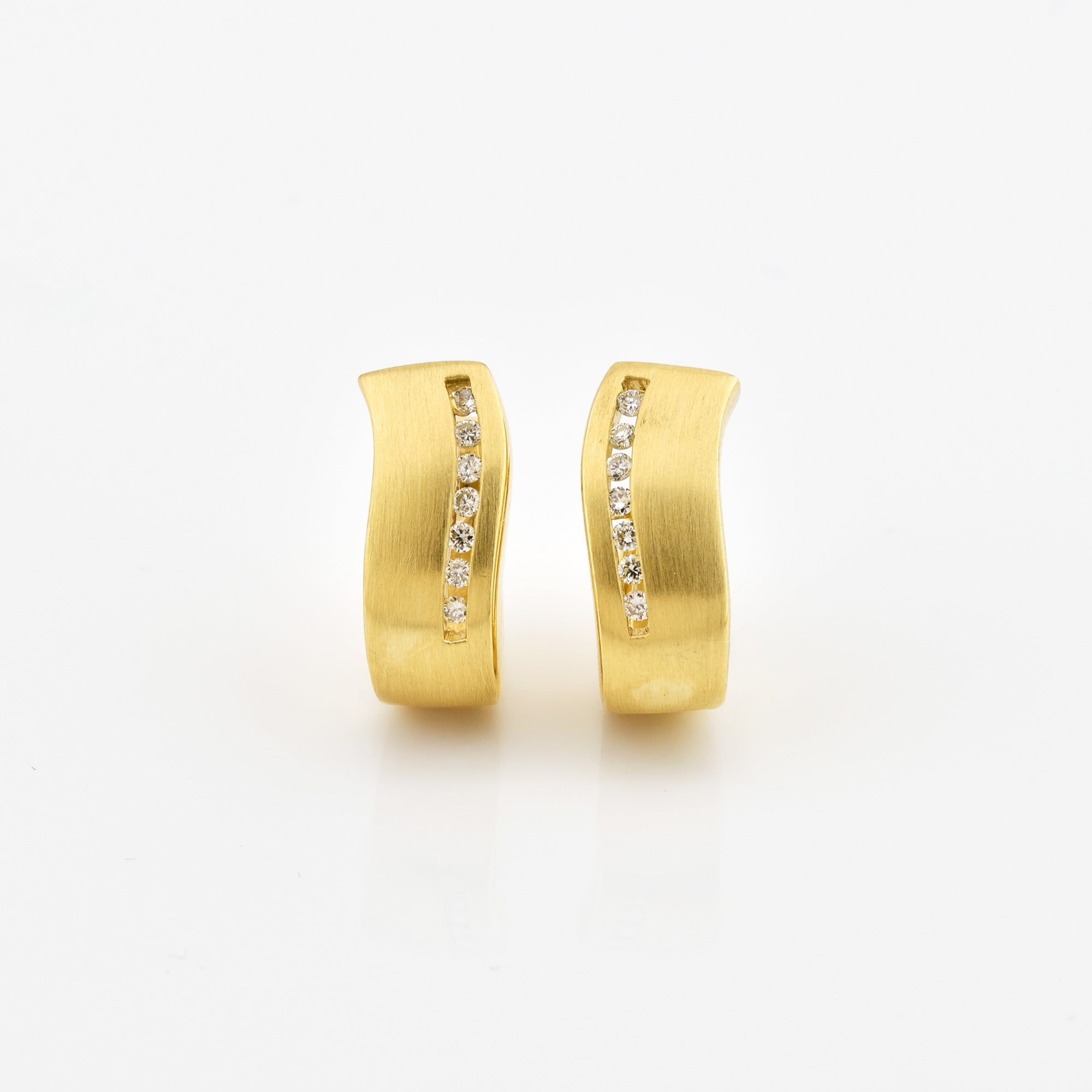 Bei dem Schmuckstück handelt es sich um ein Paar Creolen aus 585 Gelbgold mit 14 Brillanten von zusammen ca. 0,15 ct in der Qualität getöntes Weiß und lupenrein (Cr/lupenrein).