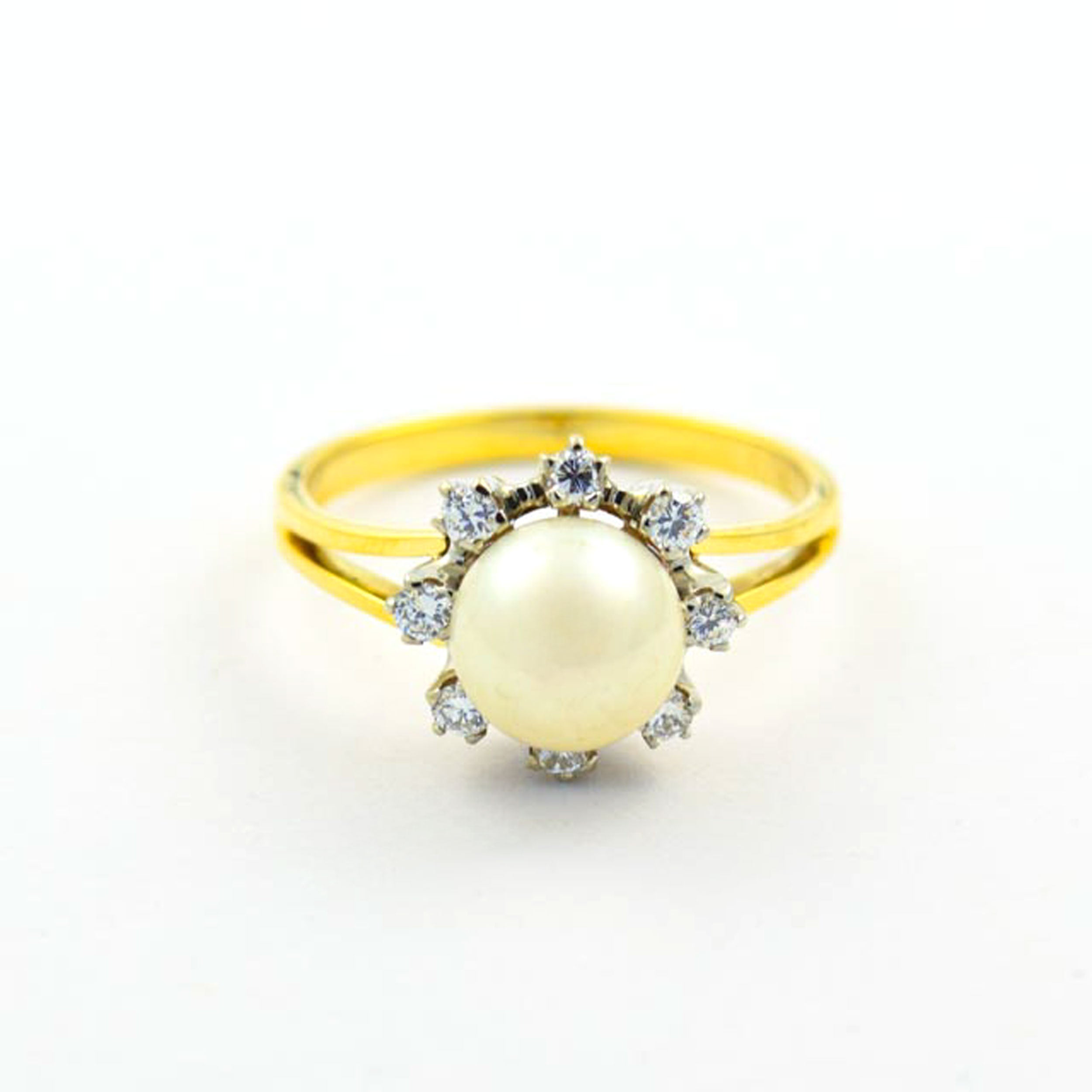 Bei dem Schmuckstück handelt es sich um einen Ring aus 585 Gelb- und Weißgold mit einer Zuchtperle und acht Brillanten von zusammen ca. 0,16 ct in der Qualität Weiß mit kleinen Einschlüssen (W/si).