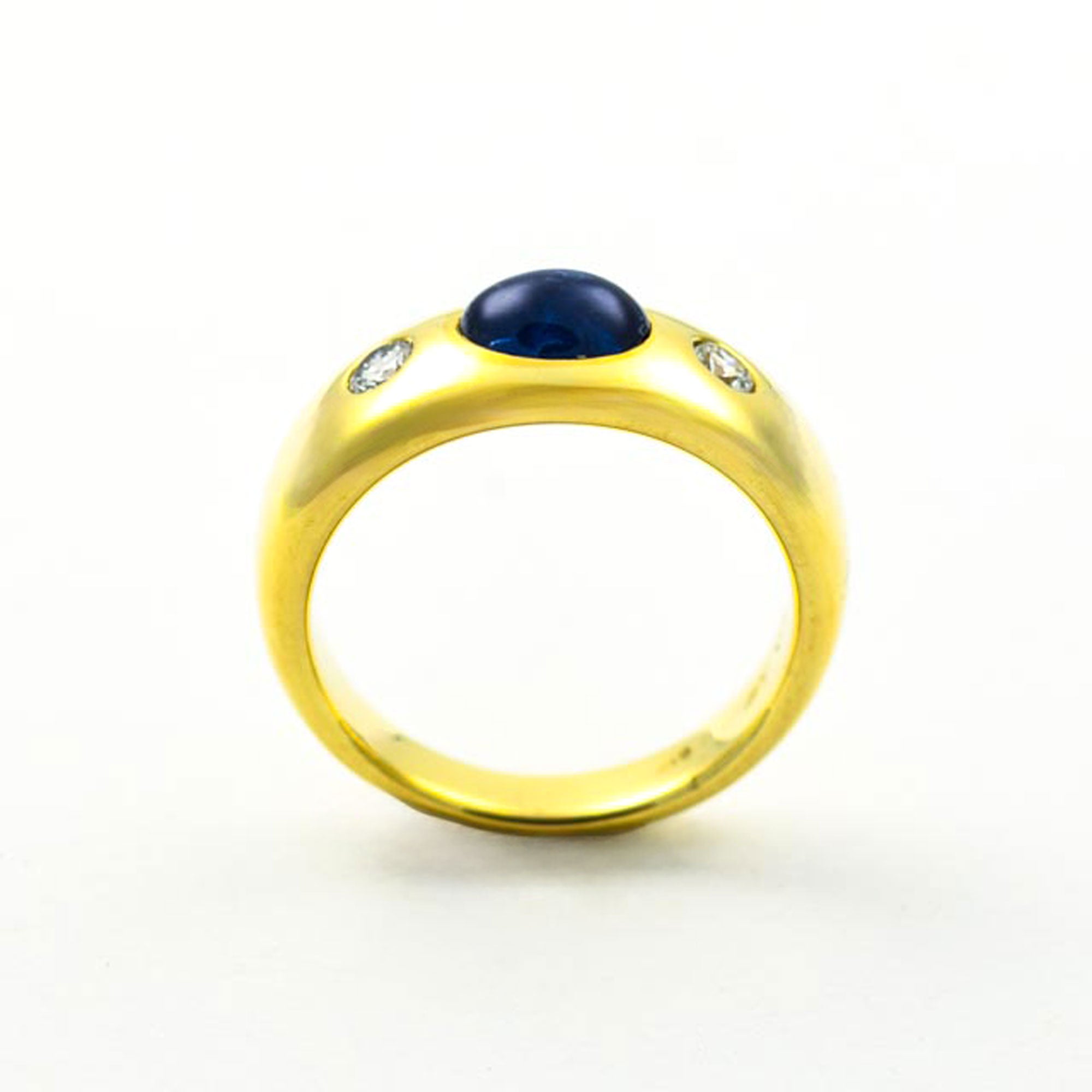 Bei dem Schmuckstück handelt es sich um einen Bandring aus 585 Gelbgold mit einem Saphircabochon und zwei Brillanten von zusammen ca. 0,18 ct in der Qualität Weiß mit kleinen Einschlüssen (W/si).