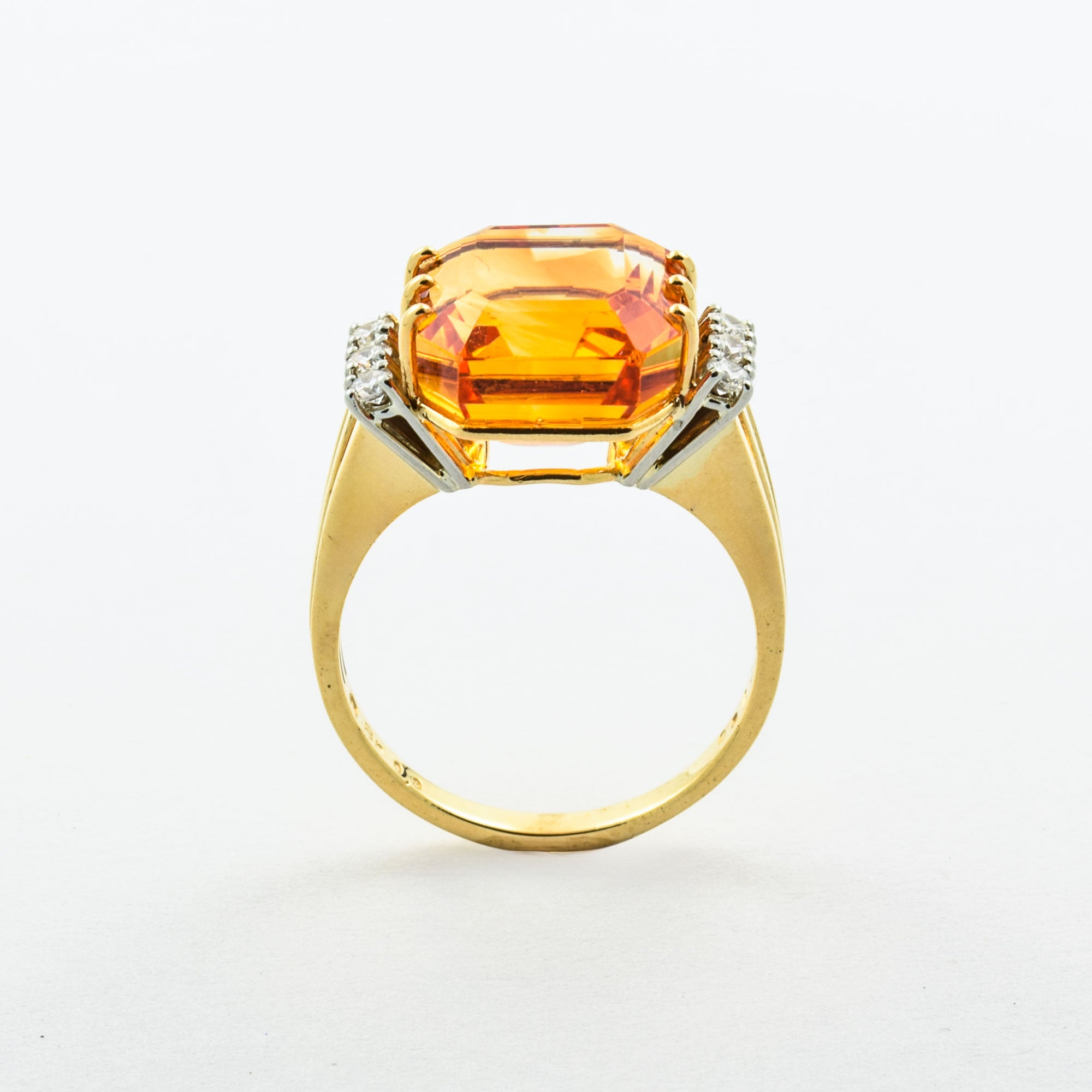 Bei dem Schmuckstück handelt es sich um einen Ring von Juwelier Richarz aus 750 Gelb- und Weißgold mit einem Citrin und sechs Brillanten von zusammen ca. 0,3 ct in der Qualität feines Weiß mit sehr kleinen Einschlüssen (TW/vs).