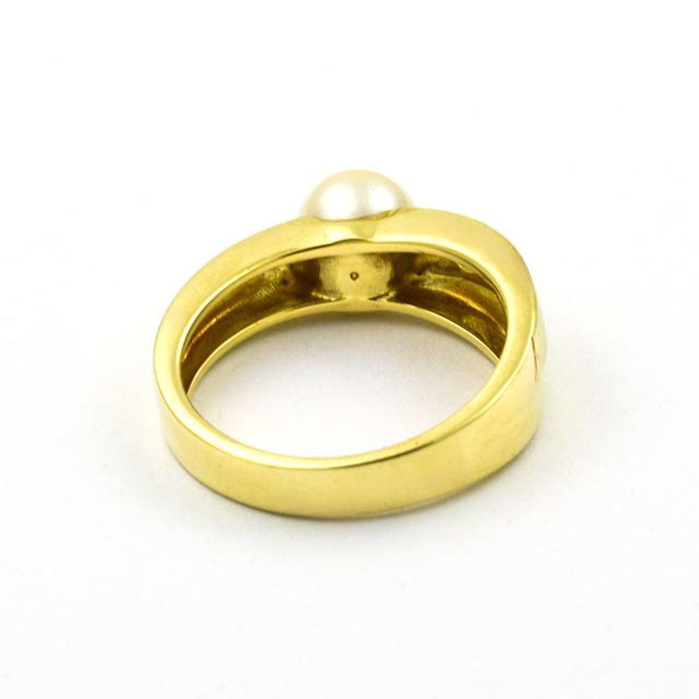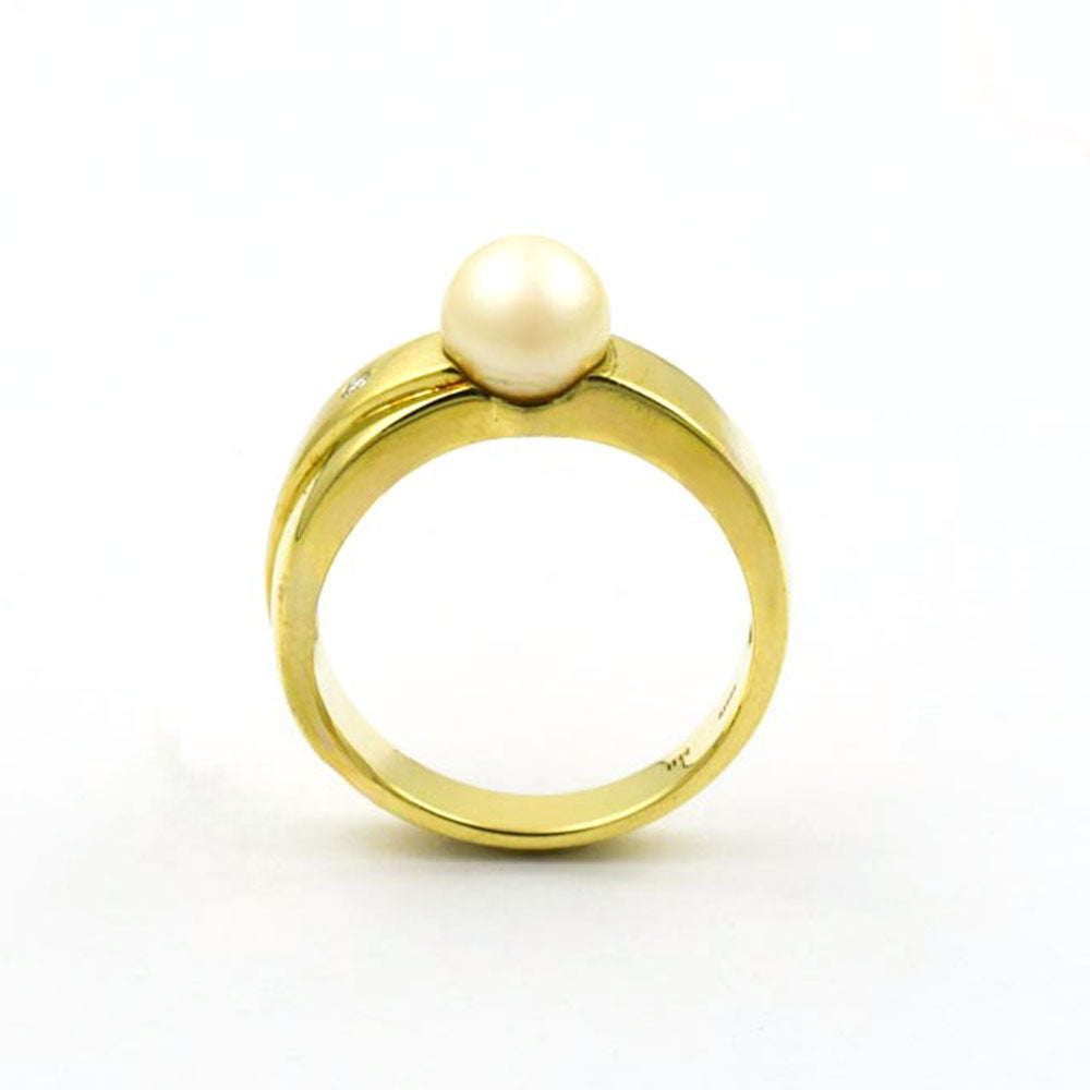 Bei dem Schmuckstück handelt es sich um einen Ring aus 585 Gelbgold mit einer Akoyazuchtperle und einem Brillanten von ca. 0,02 ct in der Qualität Weiß mit kleinen Einschlüssen (W/si).