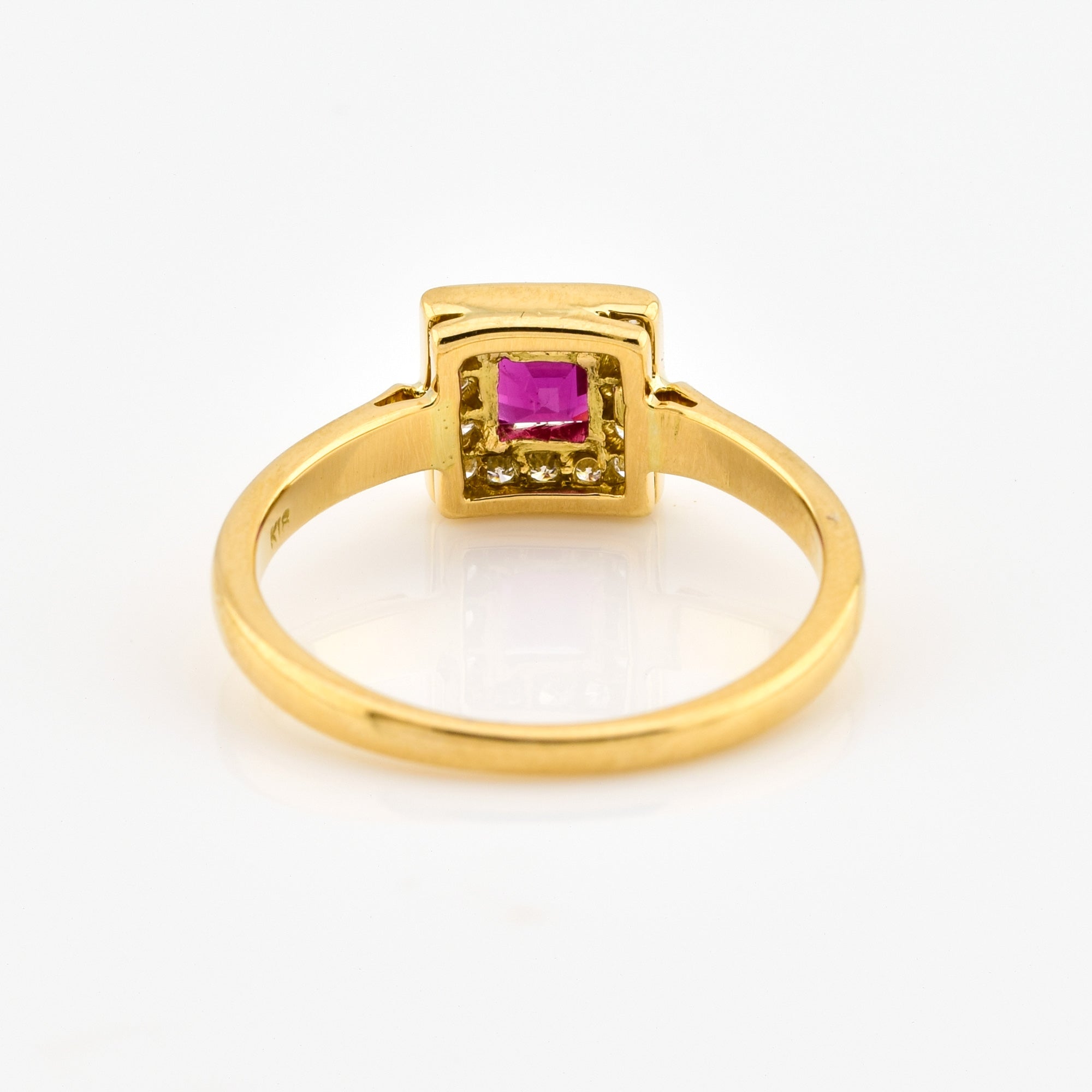 Bei dem Schmuckstück handelt es sich um einen Ring aus 750 Gelbgold mit einem Rubincarré und 16 Brillanten von zusammen ca. 0,16 ct in der Qualität Weiß mit kleinen Einschlüssen (W/si).
