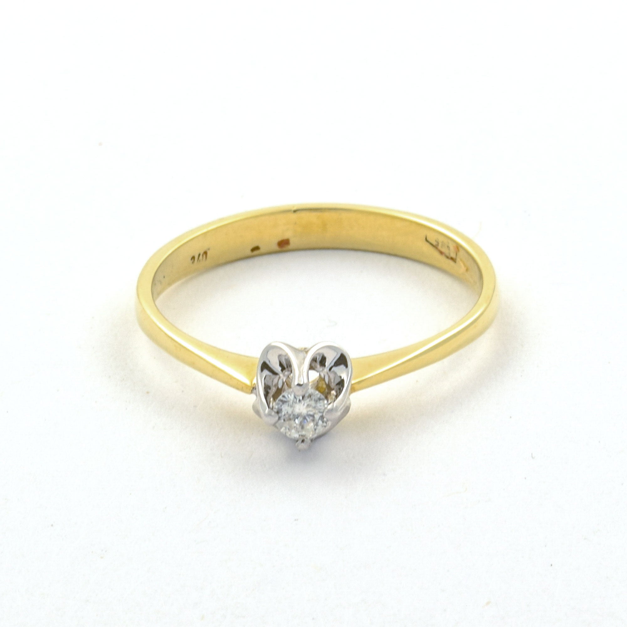 Bei dem Schmuckstück handelt es sich um einen Solitärring aus 585 Gelb- und Weißgold mit einem Brillanten von ca. 0,08 ct in der Qualität Weiß und piqué 1 (W/p 1).