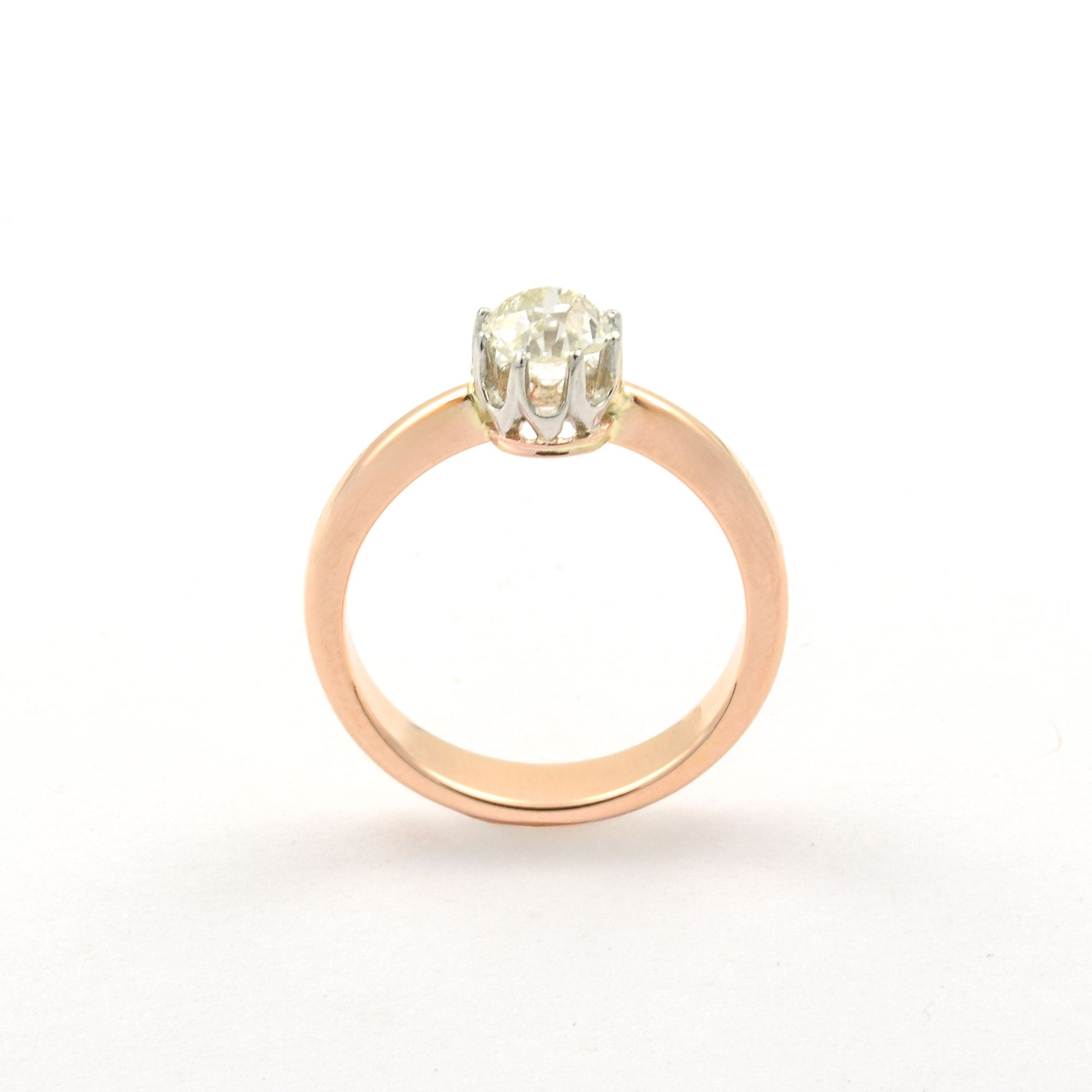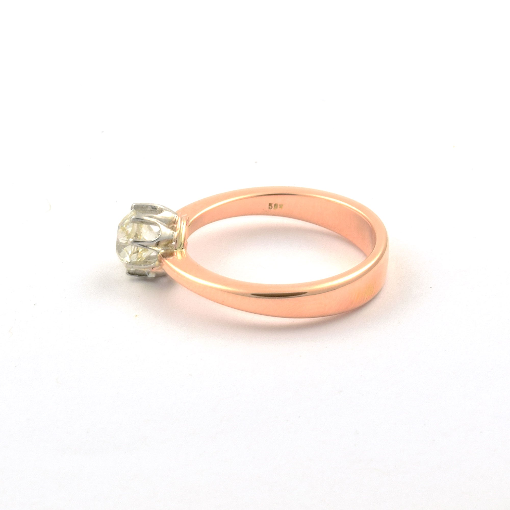 Bei dem Schmuckstück handelt es sich um einen Ring aus 585 Rosé- und Weißgold mit einem Diamanten im Altschliff von ca. 0,7 ct in der Qualität Weiß mit kleinen Einschlüssen (W/si).