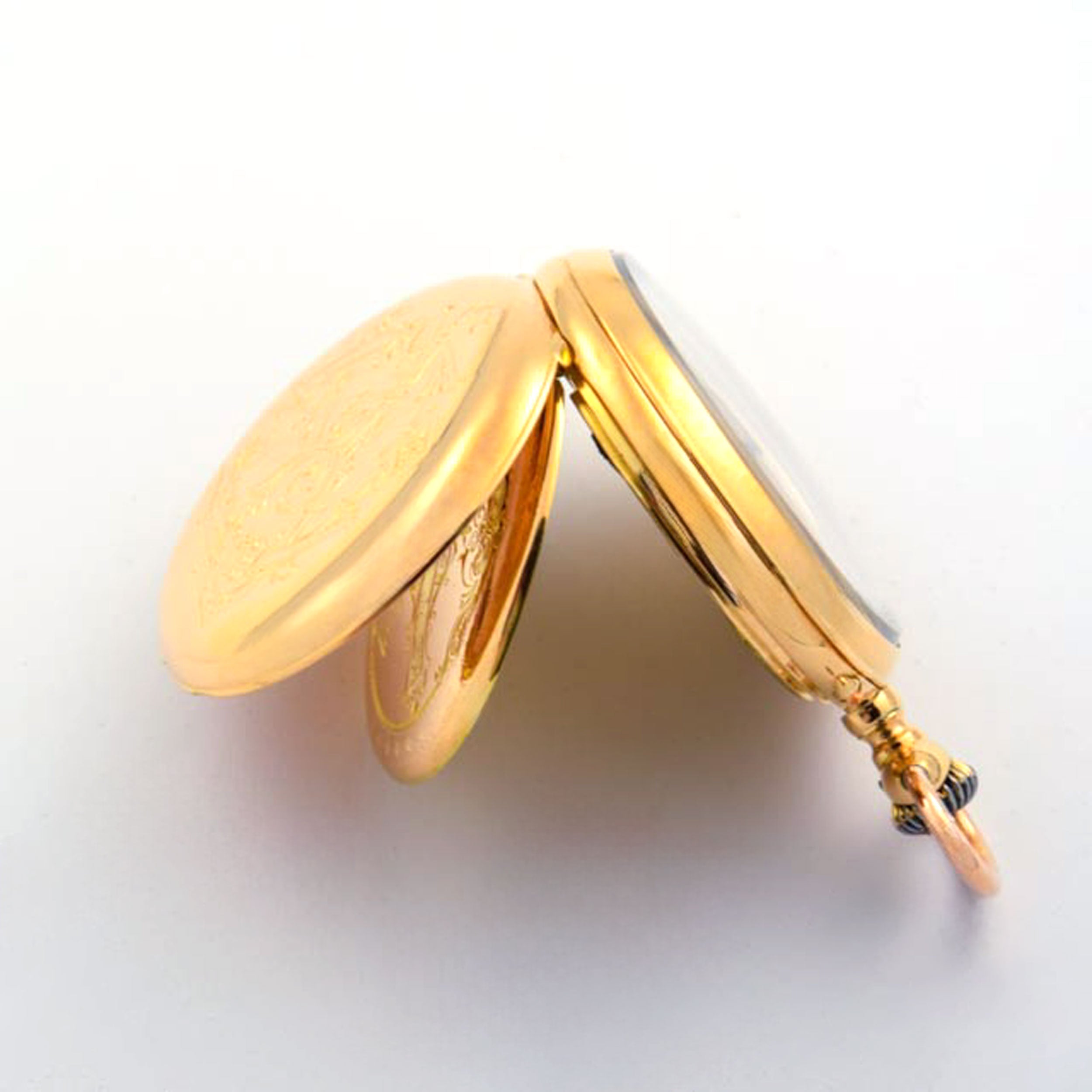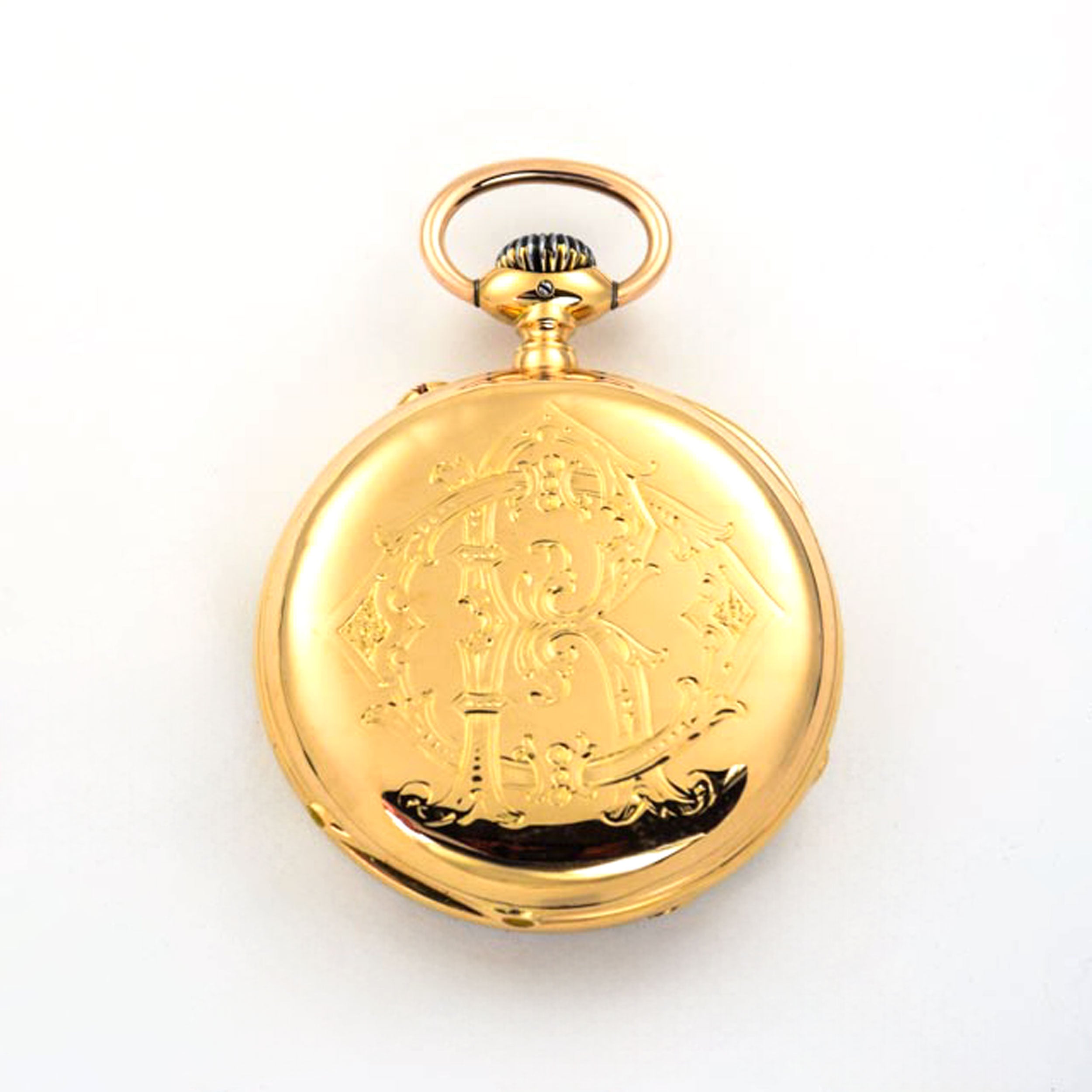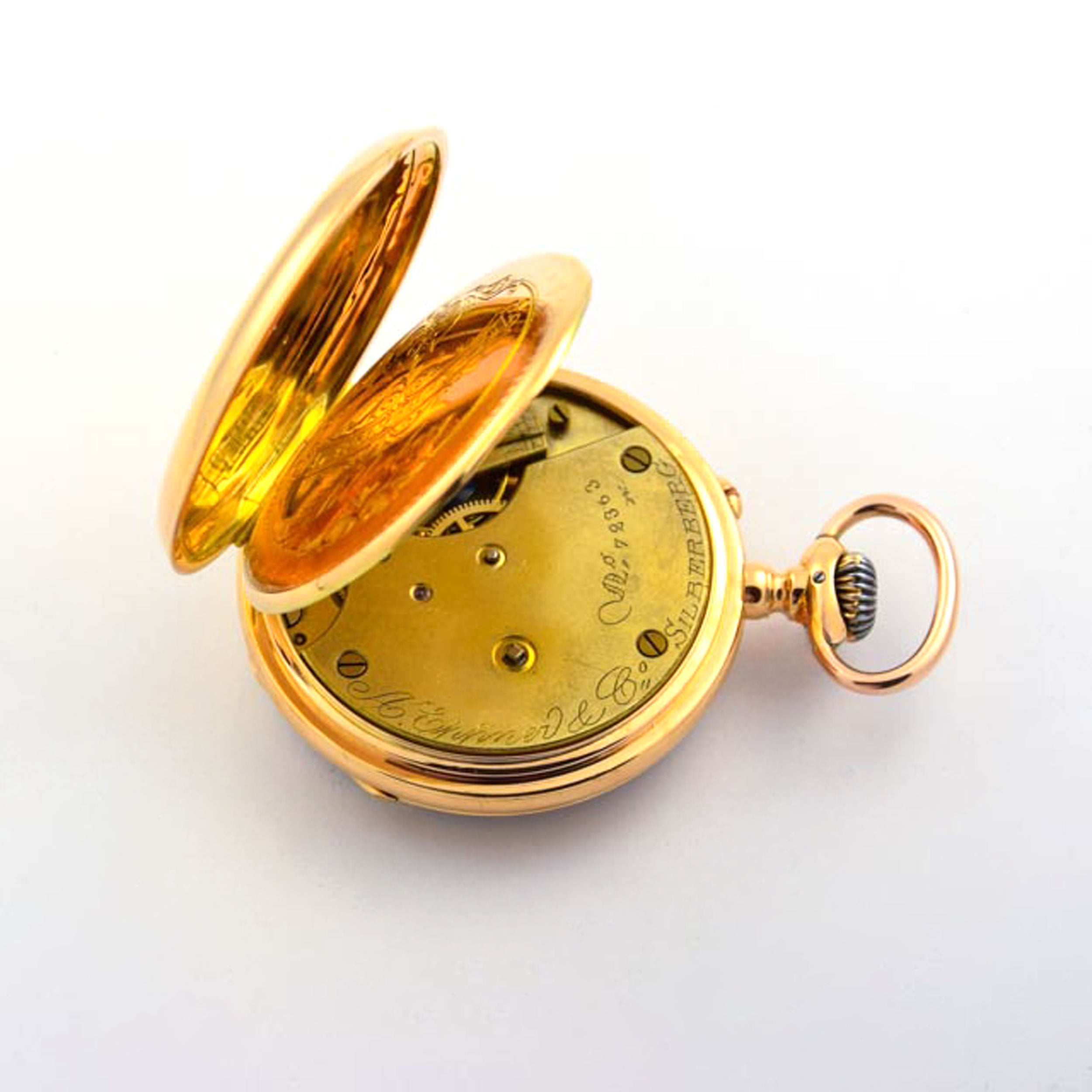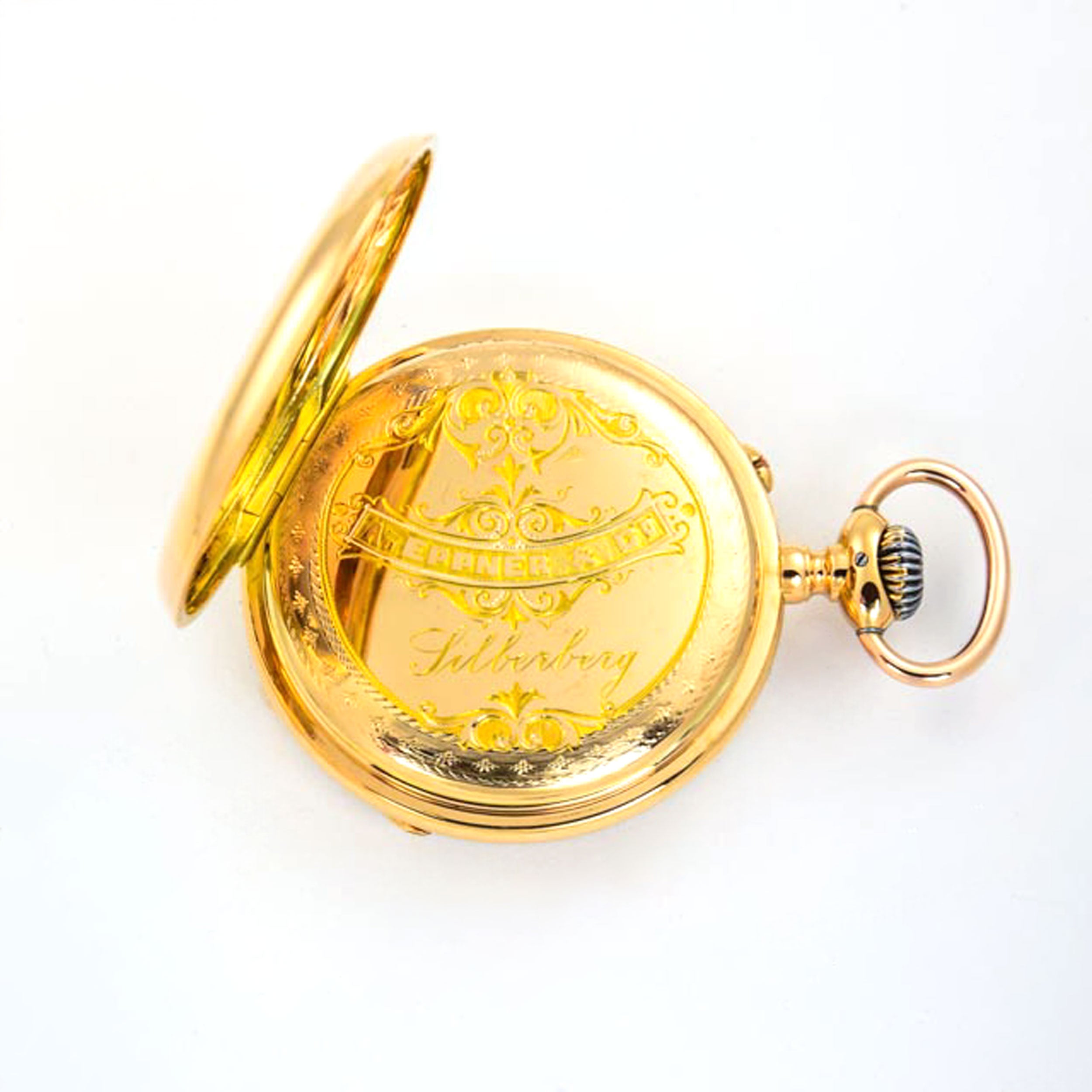 Bei dem Schmuckstück handelt es sich um eine Taschenuhr der Marke A. Eppner & Cie. Modell "Lepinè". Die Uhr wurde in den 1870er Jahren hergestellt. Das Material der Uhr ist 585 Gelbgold. Es erfolgte eine Revision durch Meisterwerkstatt im Jahr 2024.