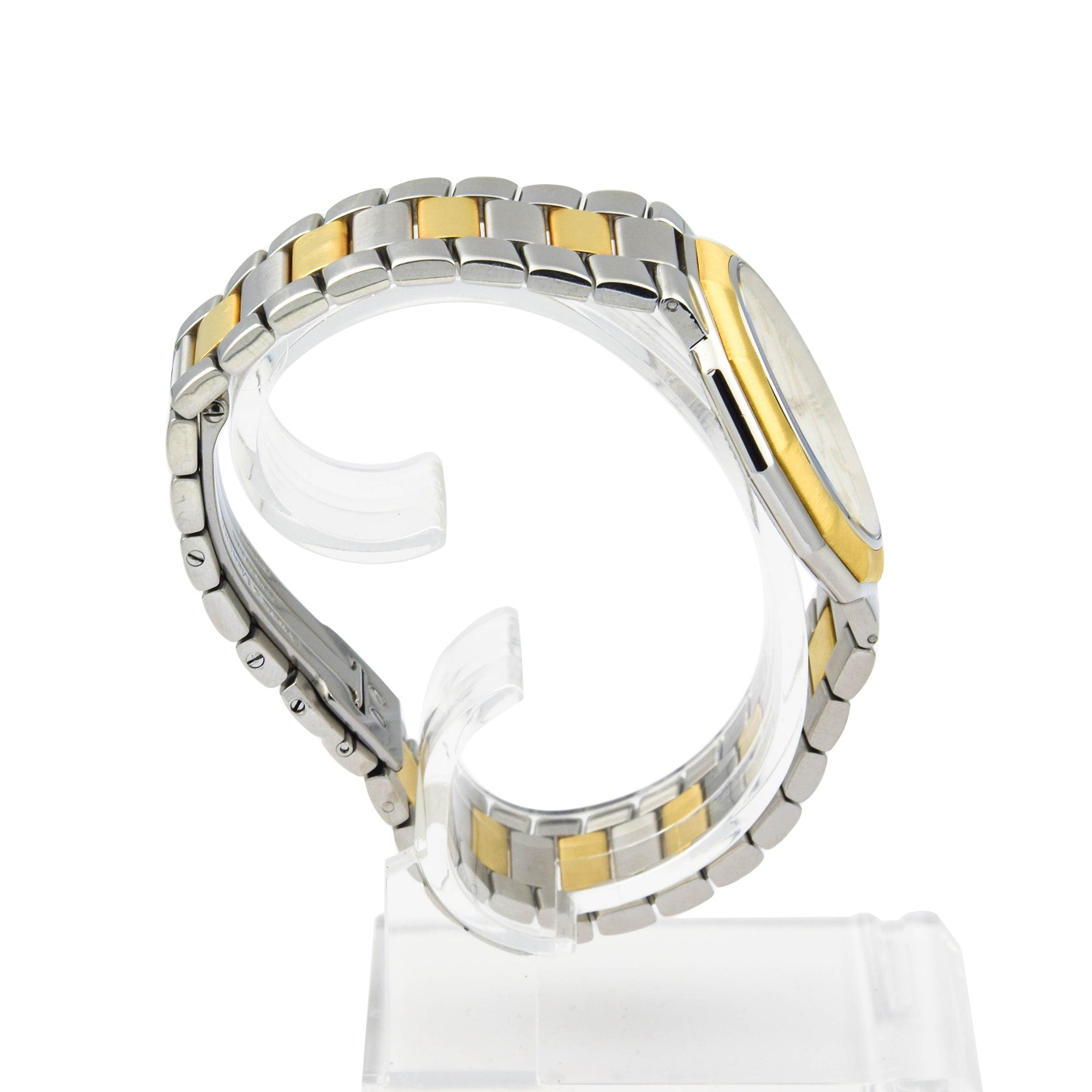 Bei dem Schmuckstück handelt es sich um eine Armbanduhr der Marke Baume & Mercier Modell "Riviera" mit der Referenznummer MV045164. Das Material der Uhr ist 750 Gelbgold/Edelstahl. Sie besitzt ein Quarzwerk Kaliber mit Steinen. Die Uhr ist mit einer Datumsanzeige ausgestattet und verfügt über eine Schnellschaltung und eine verschraubte Krone. Es erfolgte eine Revision durch Baume & Mercier. Eine Box und Papiere liegen vor.