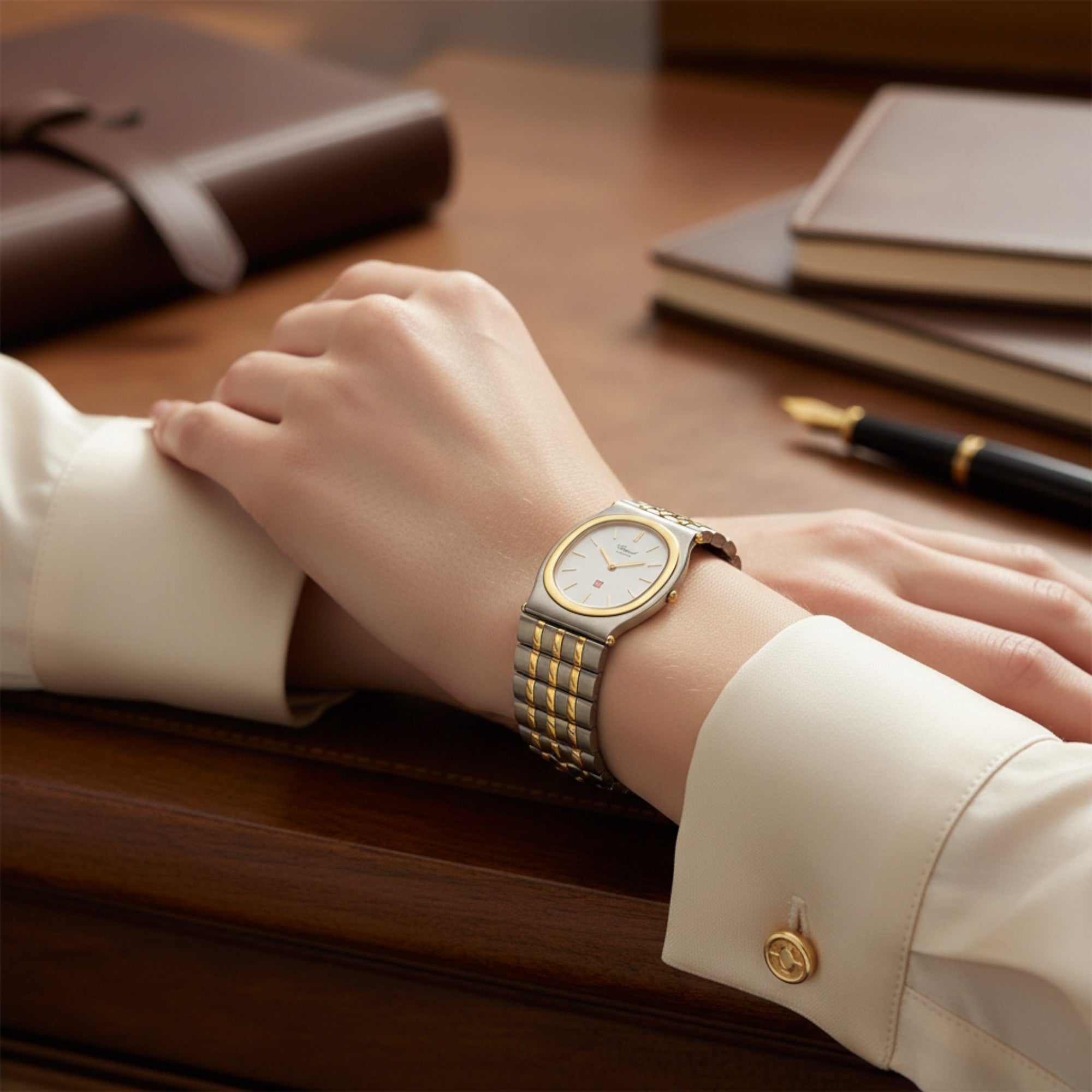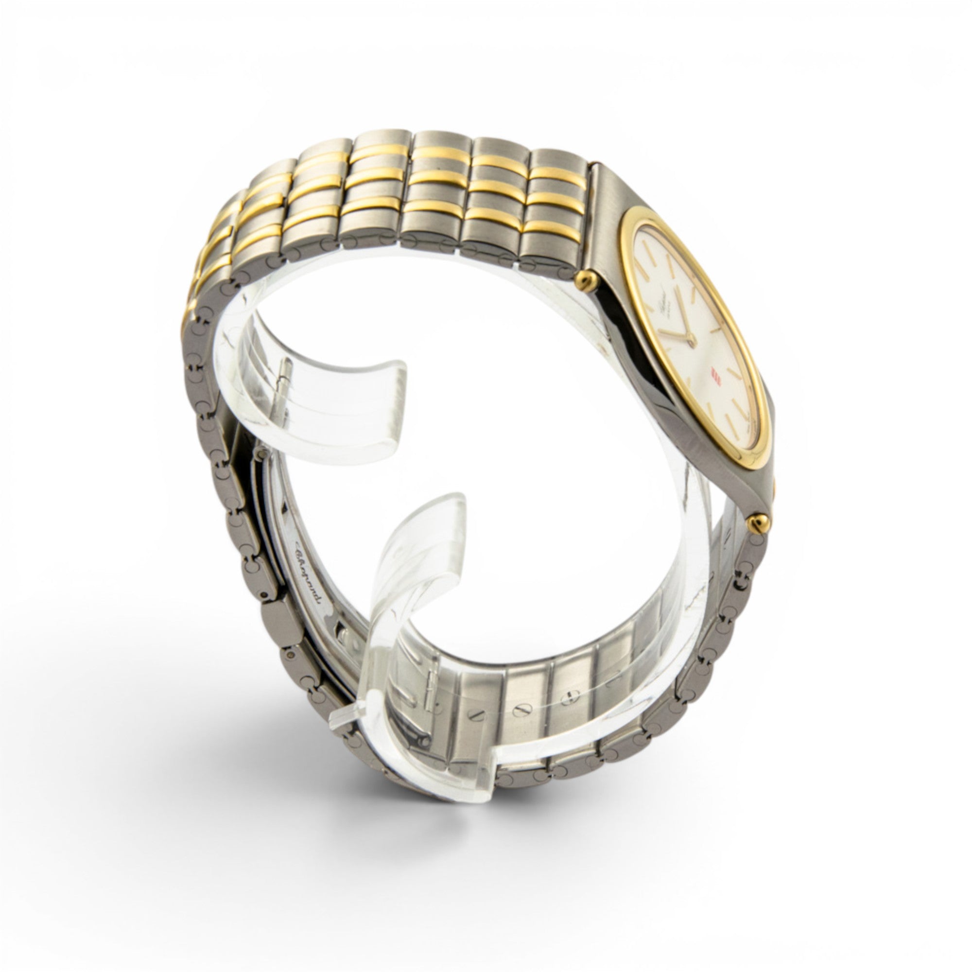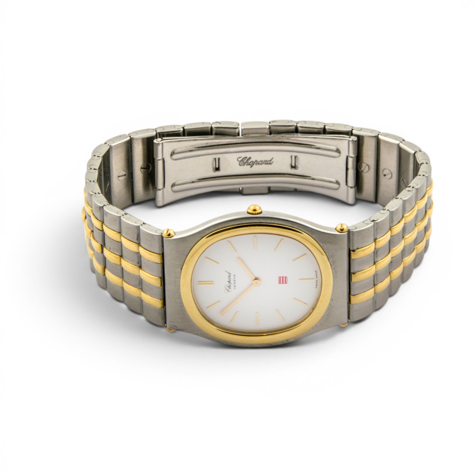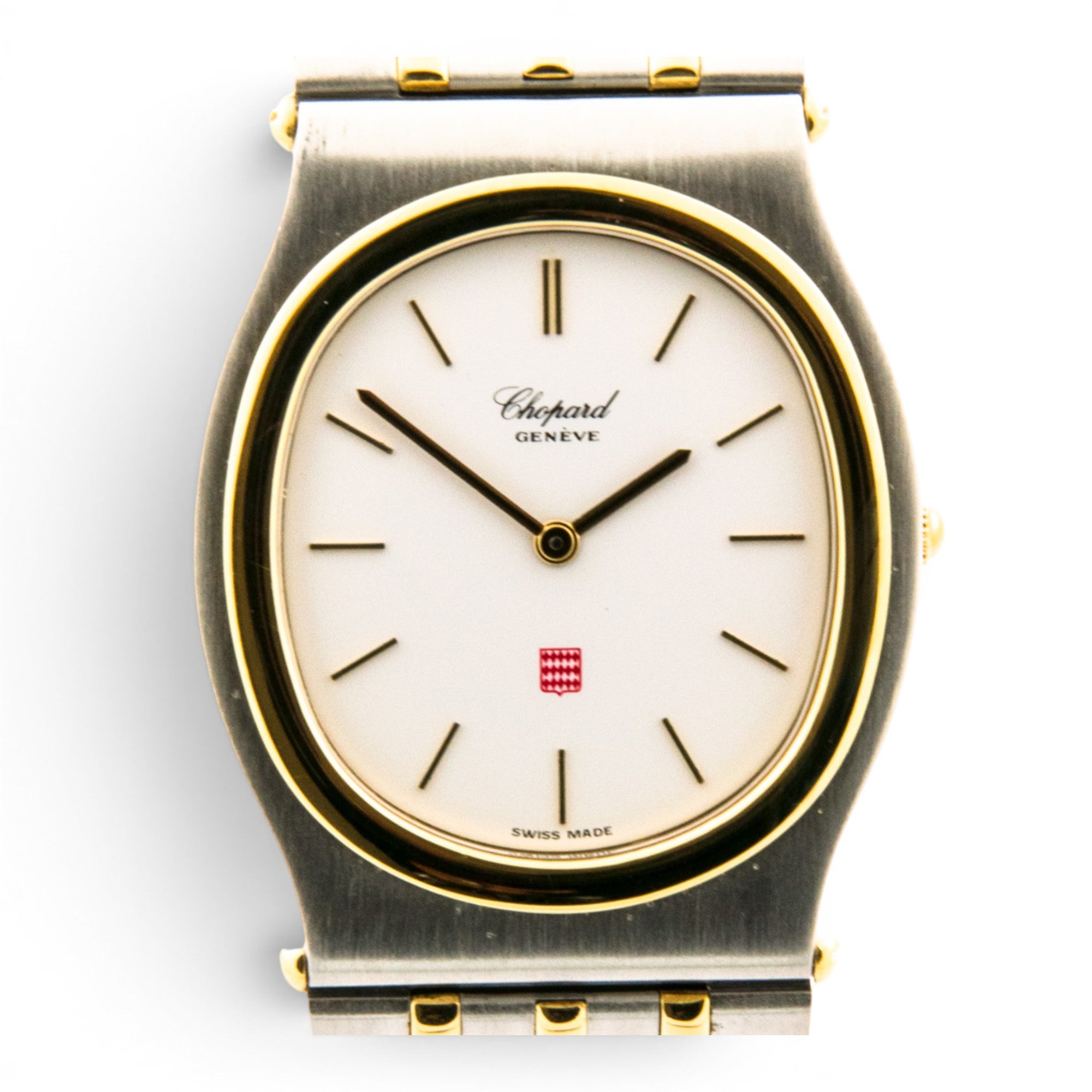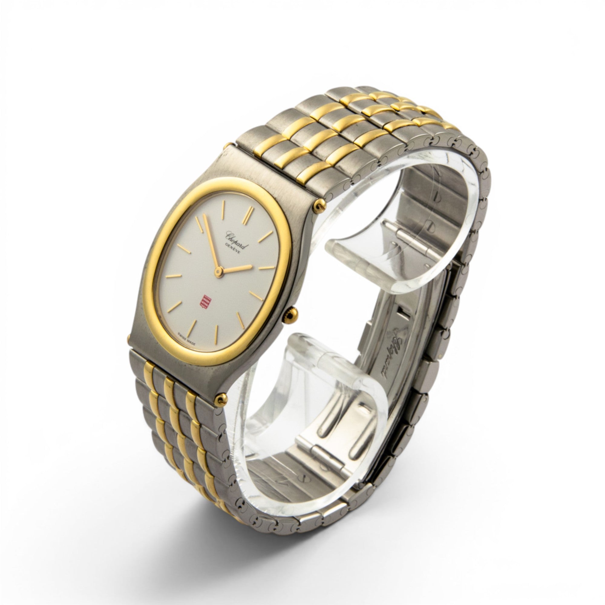 Bei dem Schmuckstück handelt es sich um eine Armbanduhr der Marke Chopard Modell "Monte-Carlo" mit der Referenznummer 318035-4002. Das Material der Uhr ist 750 Gelbgold/Edelstahl. Sie besitzt ein Quarzwerk. Es erfolgte eine Revision durch Chopard.