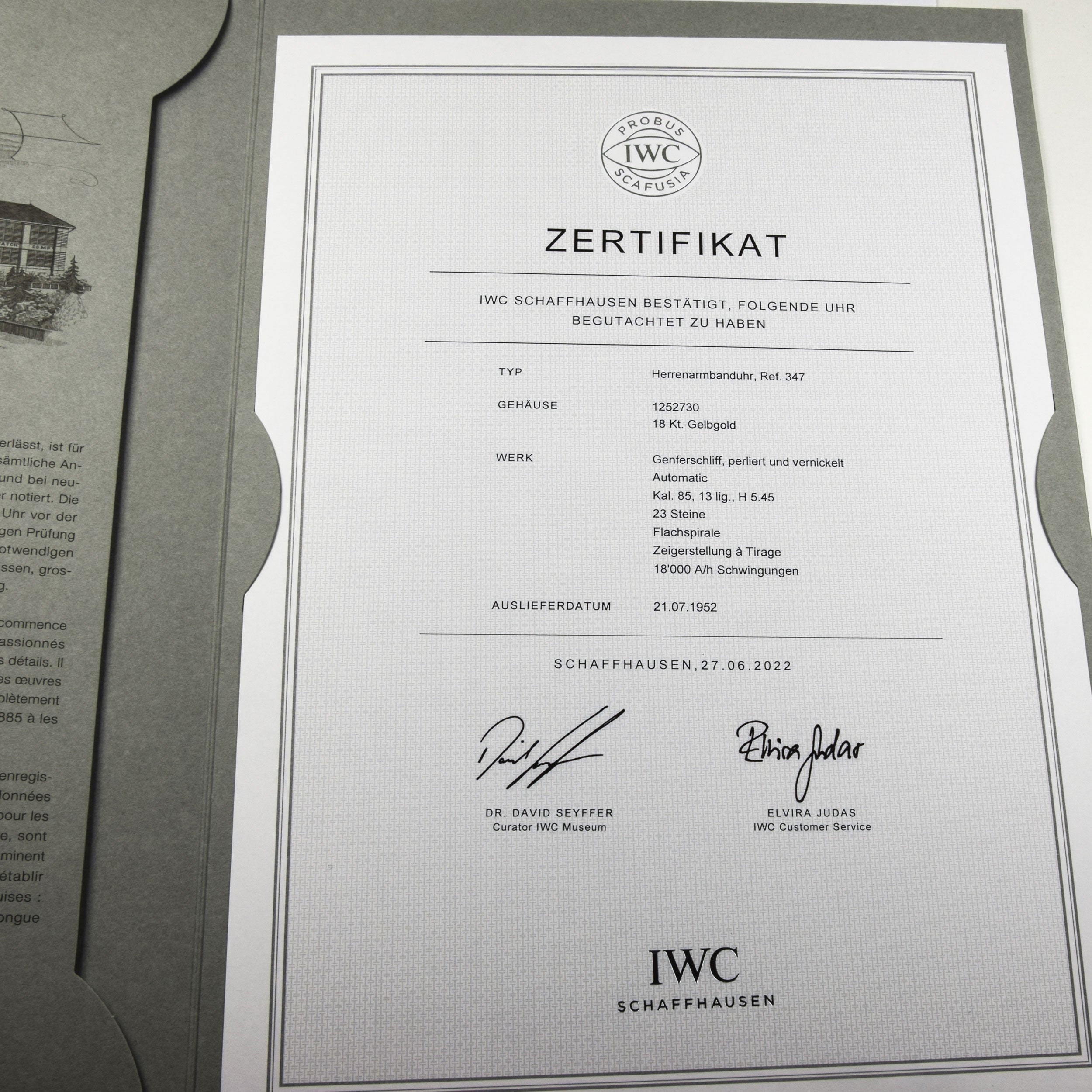 Bei dem Schmuckstück handelt es sich um eine Herrenarmbanduhr der Marke IWC Modell "Automatik" mit der Serien-/Referenznummer 1252730 / 1229837. Das Material der Uhr ist 750 Gelbgold. Sie besitzt ein Automatik Kaliber 85 (8400 Stück) mit 21 Steinen. Die Uhr verfügt über eine Zentralsekunde. Sie hat eine Gangreserve von 44 Stunden. Die Armbanduhr wurde im Jahr 1950 hergestellt. Es erfolgte eine Revision durch IWC. Ein IWC-Stammbuchauszug liegt vor.
