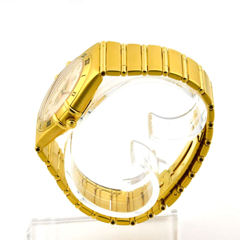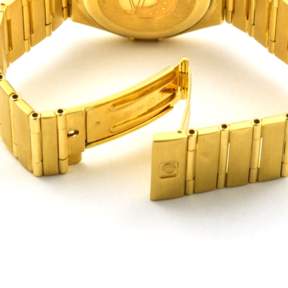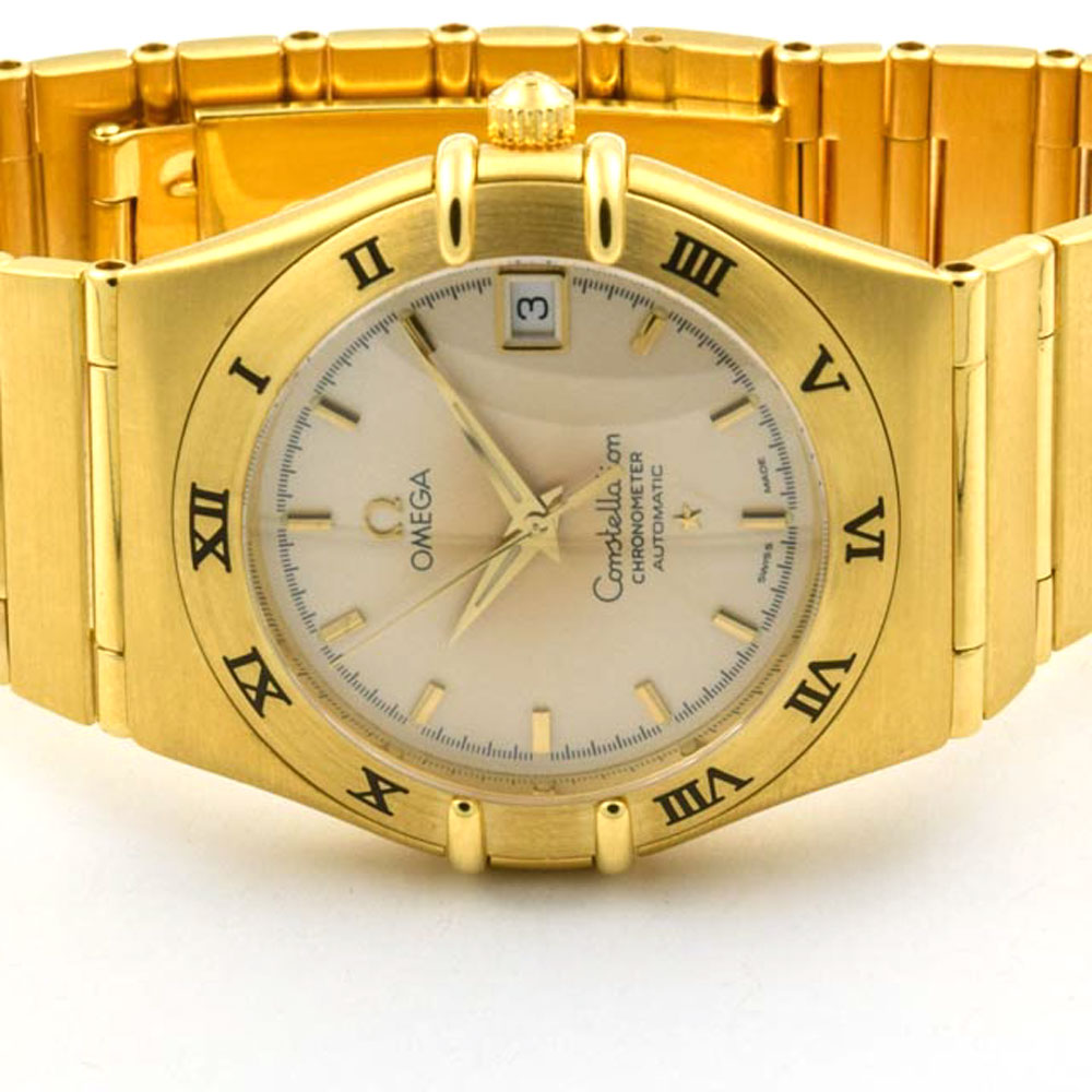 Bei dem Schmuckstück handelt es sich um eine Armbanduhr der Marke Omega Modell "Constellation 95" mit der Referenznummer 1102.30.00. Das Material der Uhr ist 750 Gelbgold. Sie besitzt ein Automatikwerk Kaliber Omega 1120 mit 25 Steinen. Die Uhr ist mit einer Datumsanzeige ausgestattet und verfügt über Leuchtindizes, Schnellschaltung und eine Zentralsekunde und ist Reguliert in 5 Positionen und Temperaturen, hat einen Unruhstop und ist als Chronometer zertifiziert. Sie hat eine Gangreserve von 47 Stunden. Die Armbanduhr ist aus der Zeit der 1990er Jahre. Es erfolgte eine Revision durch Omega.