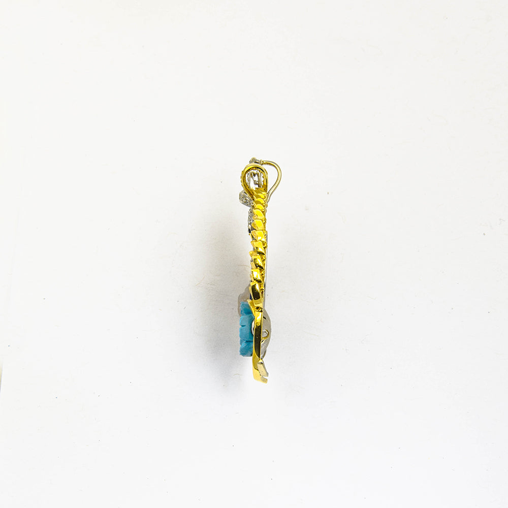 Bei dem Schmuckstück handelt es sich um einen Anhänger aus 750 Gelb- und Weißgold mit einem Lapislazuli, einem Türkis, einem Saphir, 1 Zuchtperle und 51 Diamanten von zusammen ca. 0,36 ct in der Qualität Weiß mit kleinen Einschlüssen (W/si).