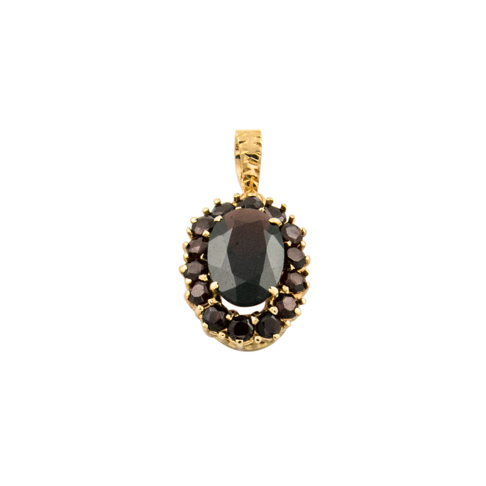 Bei dem Schmuckstück handelt es sich um einen Anhänger aus 750 Gelbgold mit 15 Granaten.