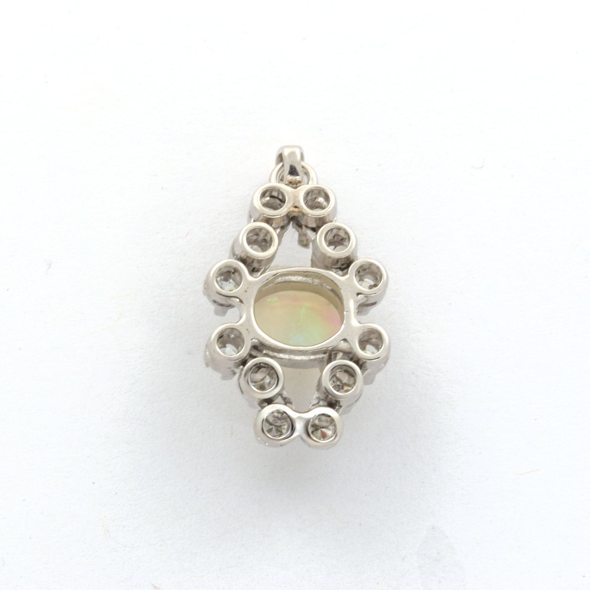 Bei dem Schmuckstück handelt es sich um einen Anhänger aus 585 Weißgold mit einem Opalcabochon und zwölf Brillanten von zusammen ca. 0,36 ct in der Qualität Weiß mit sehr kleinen Einschlüssen (W/vs).