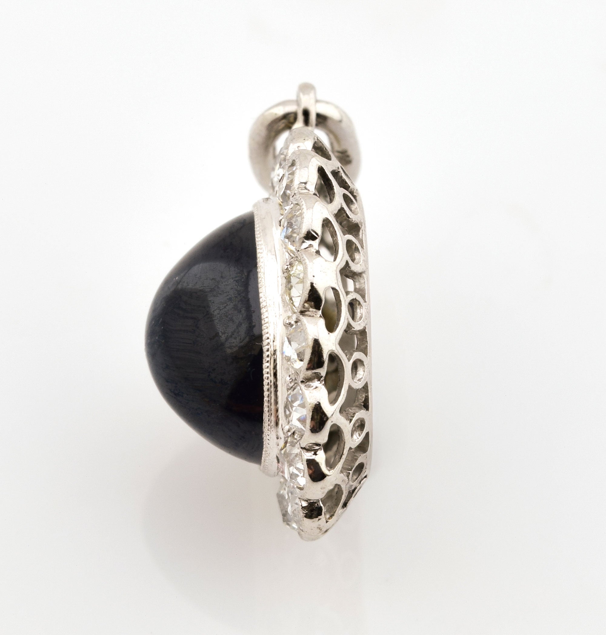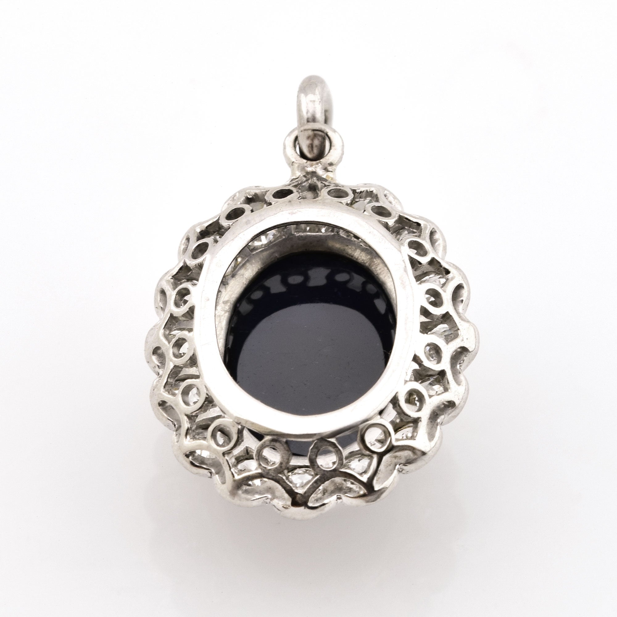 Bei dem Schmuckstück handelt es sich um einen handgearbeiteten Anhänger aus 750 Weißgold/Platin mit einem Saphircabochon und 16 Brillanten im Altschliff von zusammen ca. 0,88 ct in der Qualität Weiß mit kleinen Einschlüssen (W/si).