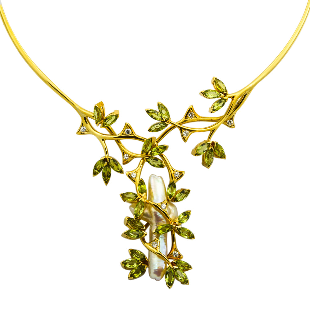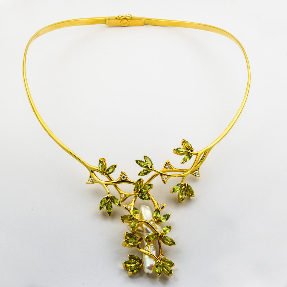 Bei dem Schmuckstück handelt es sich um ein in Handarbeit gefertigtes Collier aus 750 Gelbgold mit 33 Peridots, elf Brillanten von zusammen ca. 0,44 ct in der Qualität feines Weiß mit sehr kleinen Einschlüssen (TW/vs) und einer Süßwasserzuchtperle. Das Schmuckstück hat eine Gesamtlänge von 41 cm.