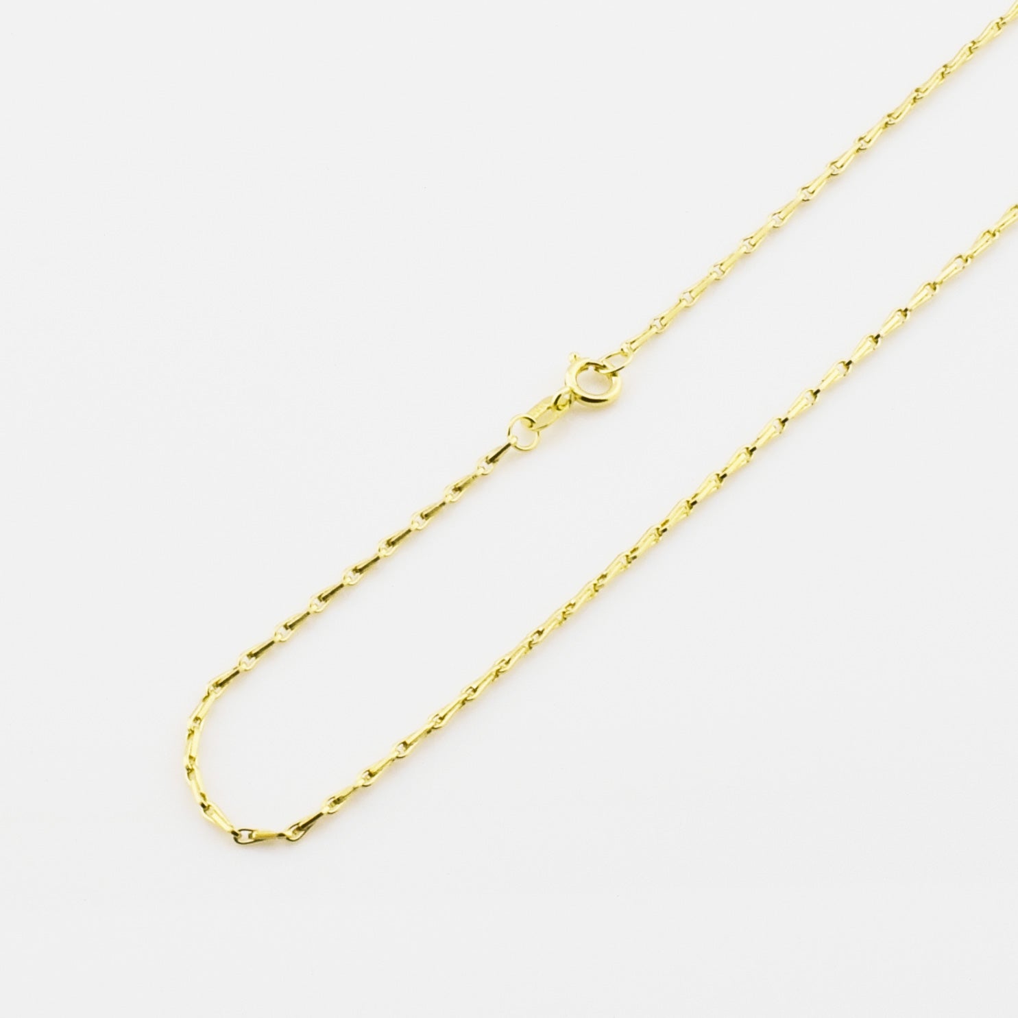 Bei dem Schmuckstück handelt es sich um eine Haferkornkette aus 585 Gelbgold. Das Schmuckstück hat eine Gesamtlänge von 45,5 cm.