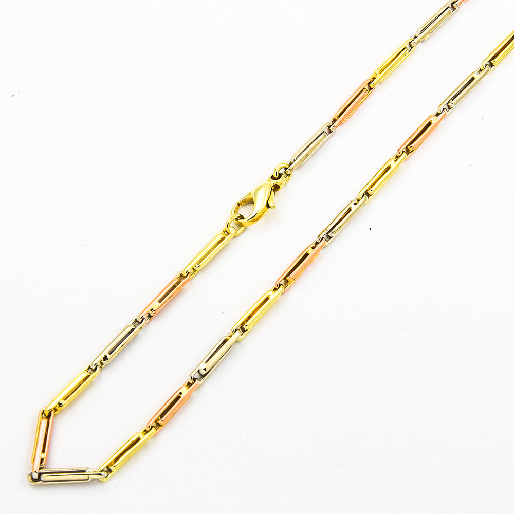 Bei dem Schmuckstück handelt es sich um eine Halskette aus 585 Gelb-, Rot- und Weißgold. Das Schmuckstück hat eine Gesamtlänge von 50 cm.