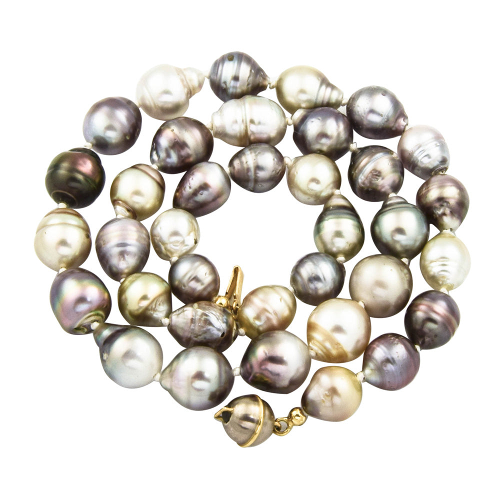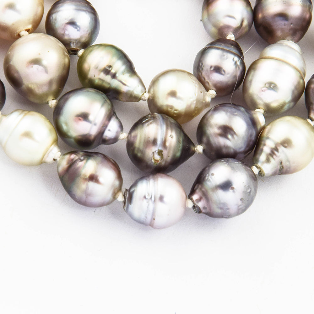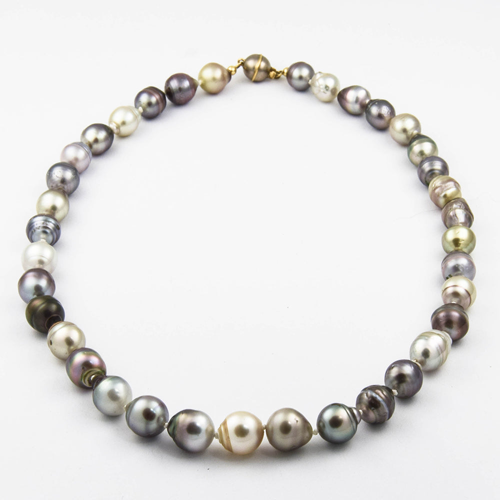 Bei dem Schmuckstück handelt es sich um eine neuwertige Tahitizuchtperlenkette mit Schließe aus 750 Gelb- und Weißgold. Das Schmuckstück hat eine Gesamtlänge von 46 cm.