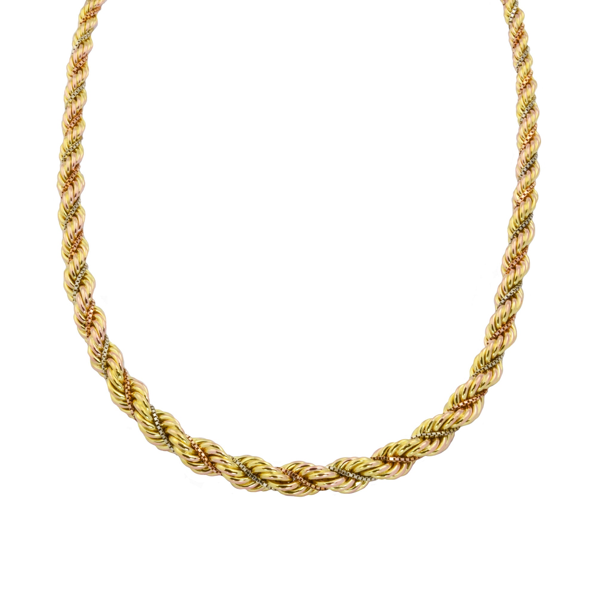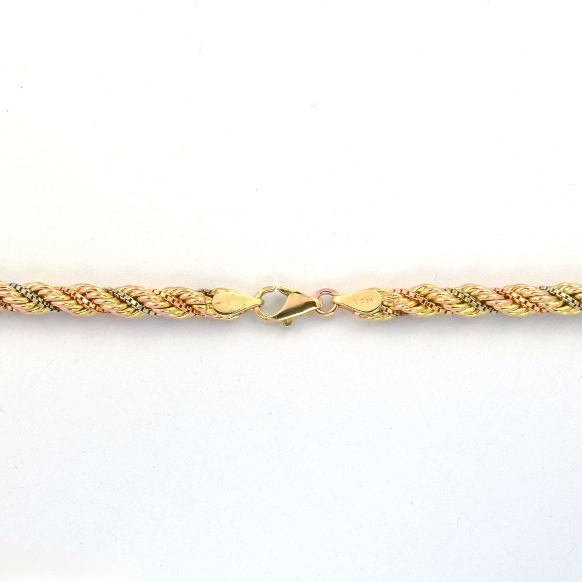 Bei dem Schmuckstück handelt es sich um eine Kordelkette im Verlauf aus 585 Gelb-, Rot- und Weißgold. Das Schmuckstück hat eine Gesamtlänge von 48 cm.