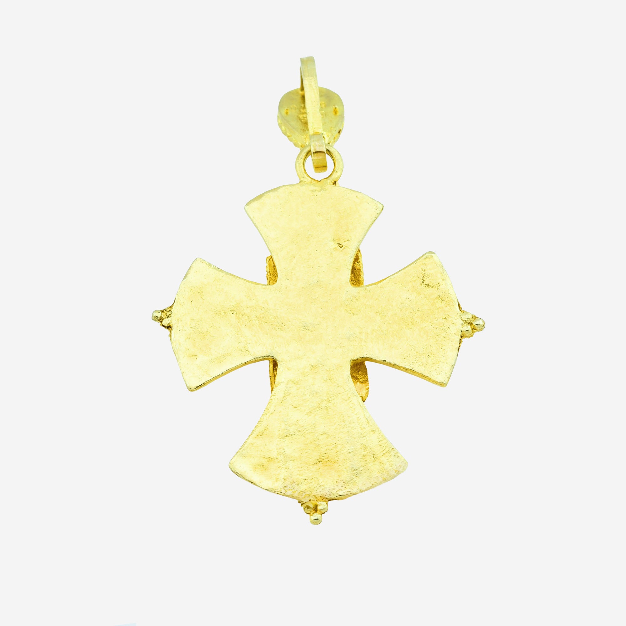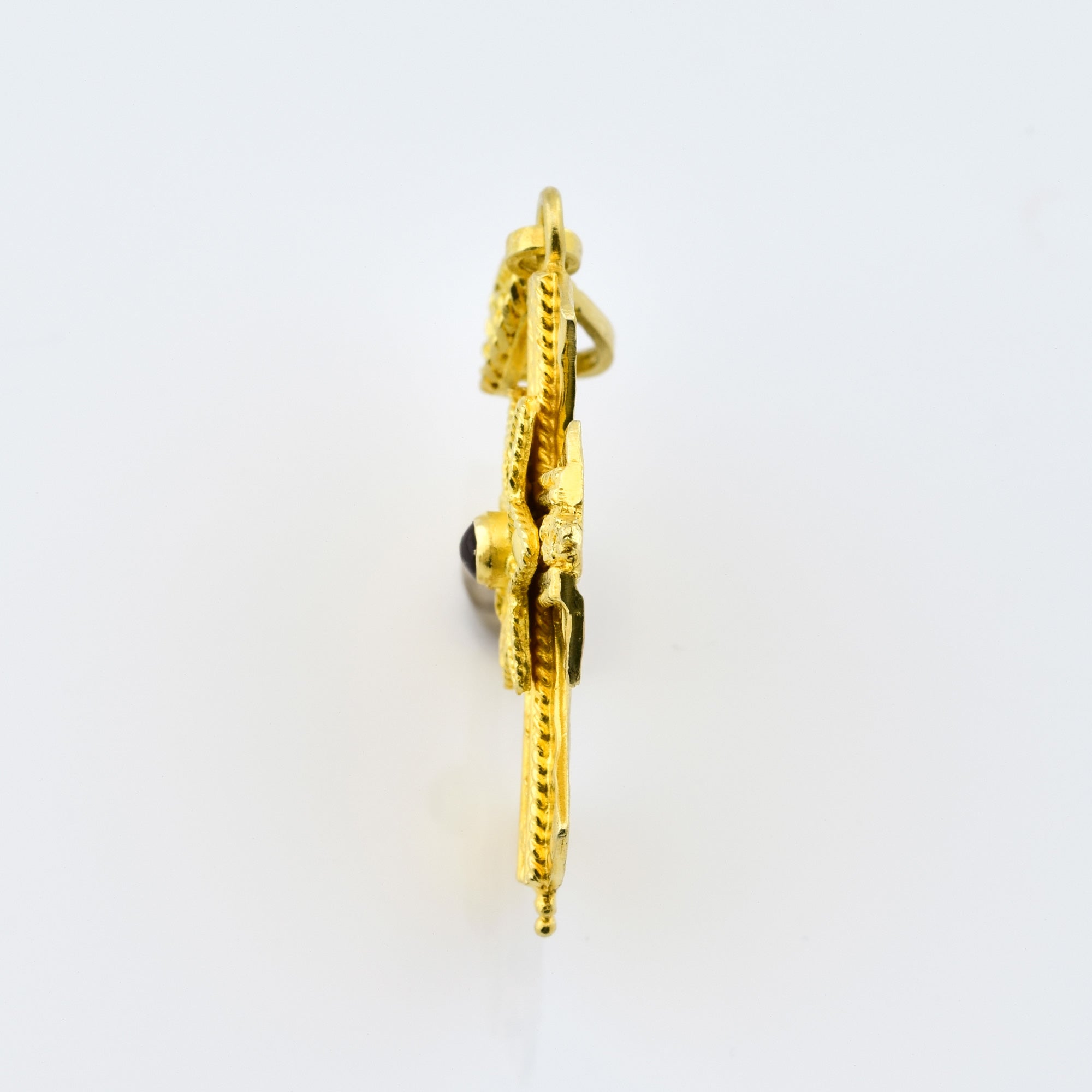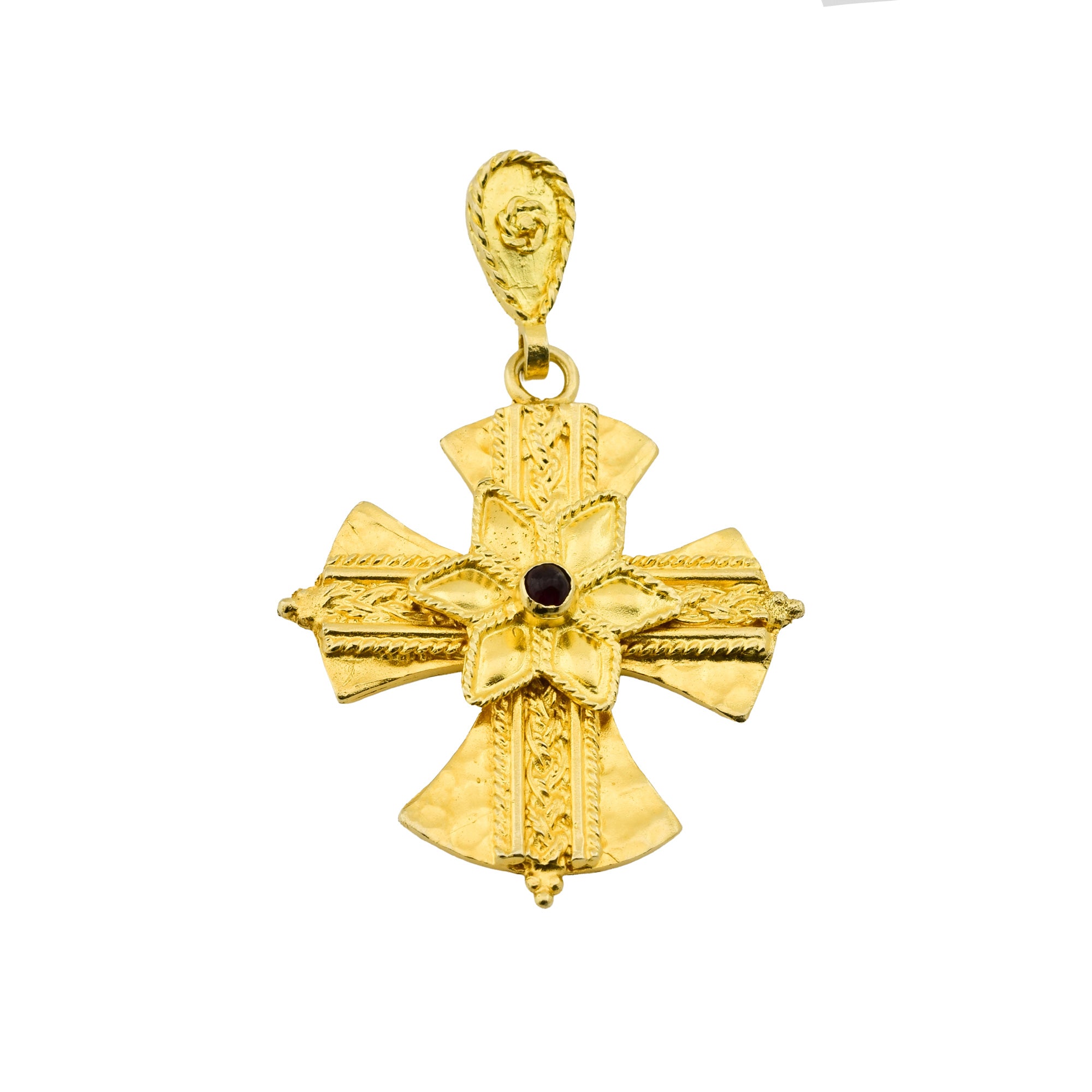 Bei dem Schmuckstück handelt es sich um einen Kreuzanhänger aus 585 Gelbgold mit einem Rubincabochon.