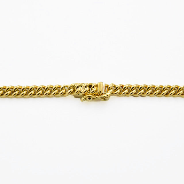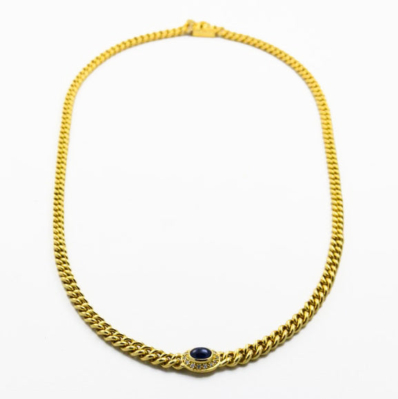 Bei dem Schmuckstück handelt es sich um ein Panzercollier im Verlauf aus 750 Gelbgold mit einem Saphircabochon und 14 Brillanten von zusammen ca. 0,14 ct in der Qualität Weiß mit kleinen Einschlüssen (W/si). Das Schmuckstück hat eine Gesamtlänge von 41,5 cm.