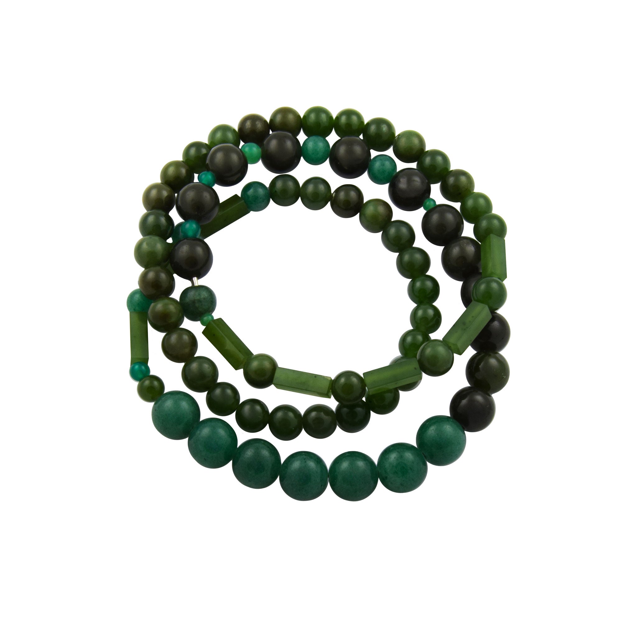 Bei dem Schmuckstück handelt es sich um eine Steinkette aus Jade, Amazonit und Quarz. Das Schmuckstück ist endlos und hat eine Gesamtlänge von 68 cm.