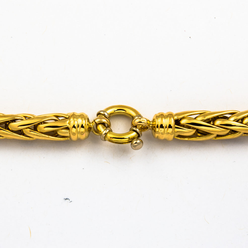 Bei dem Schmuckstück handelt es sich um eine Zopfkette aus 750 Gelbgold. Das Schmuckstück hat eine Gesamtlänge von 41 cm.