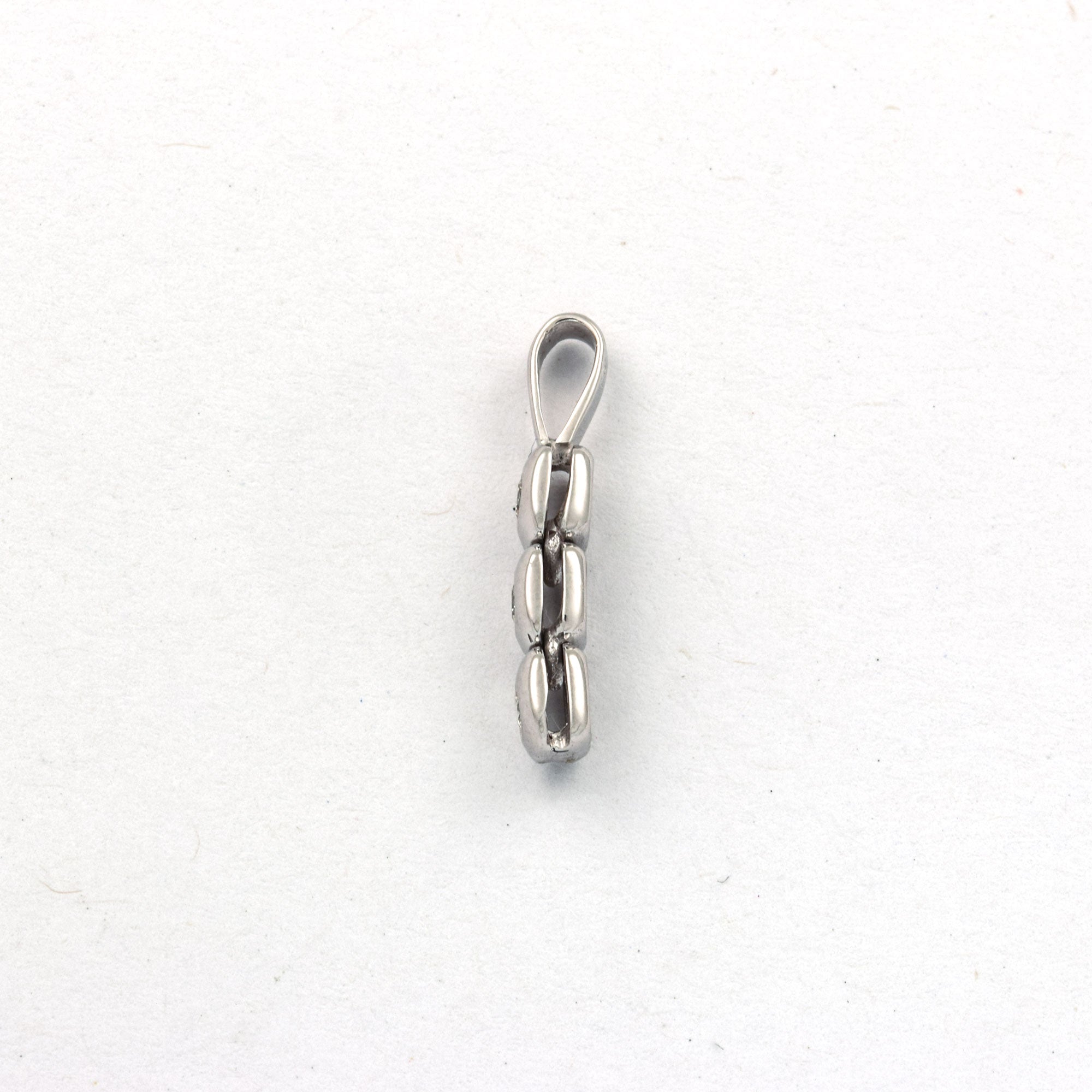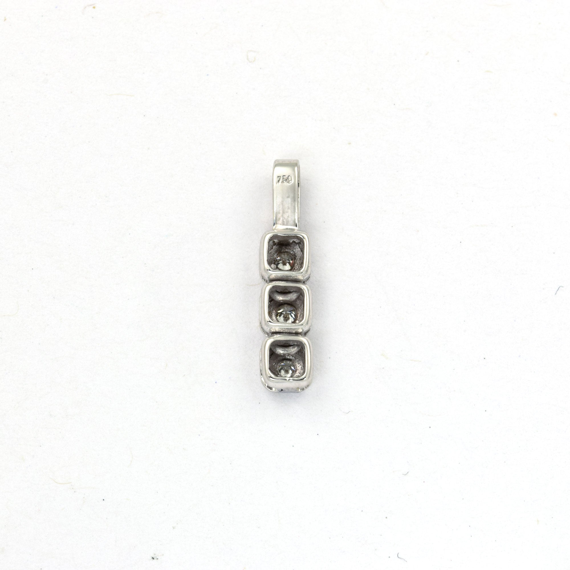 Bei dem Schmuckstück handelt es sich um einen Anhänger aus 750 Weißgold mit drei Brillanten von zusammen ca. 0,12 ct in der Qualität Weiß mit kleinen Einschlüssen (W/si)