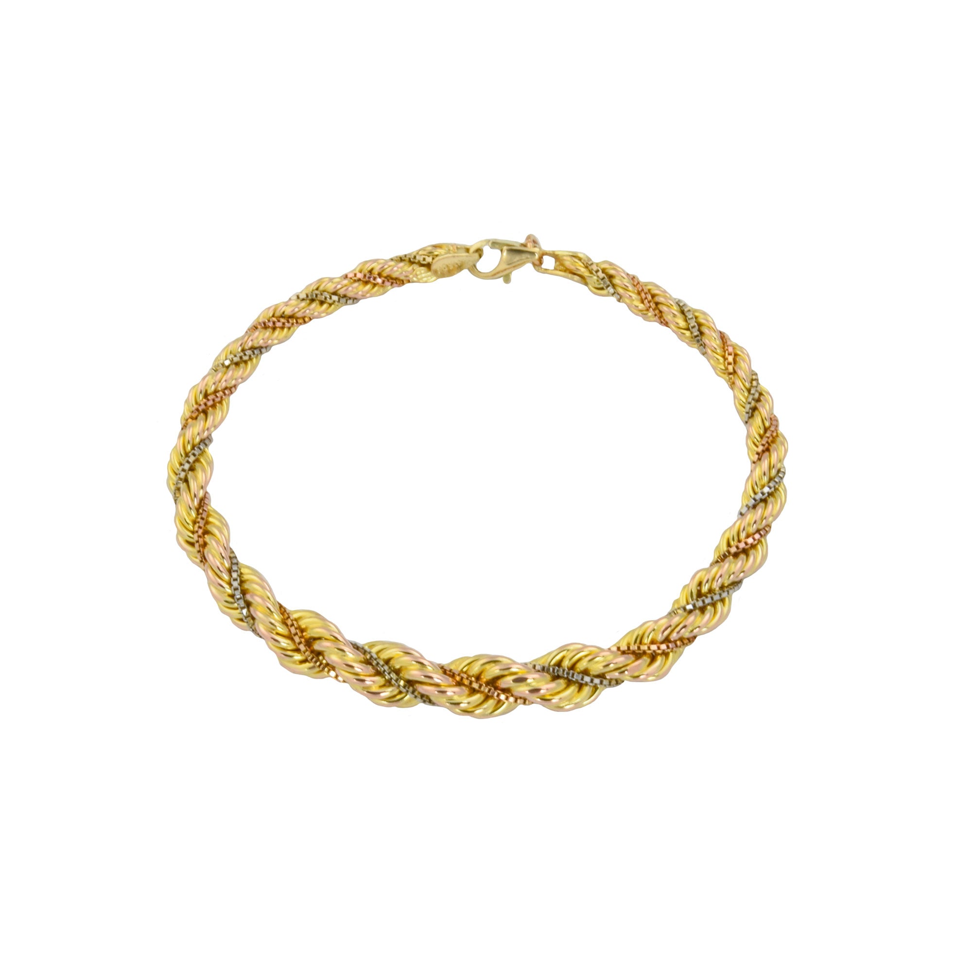 Bei dem Schmuckstück handelt es sich um ein Kordelarmband im Verlauf aus 585 Gelb-, Rot- und Weißgold. Das Schmuckstück hat eine Gesamtlänge von 21,5 cm.