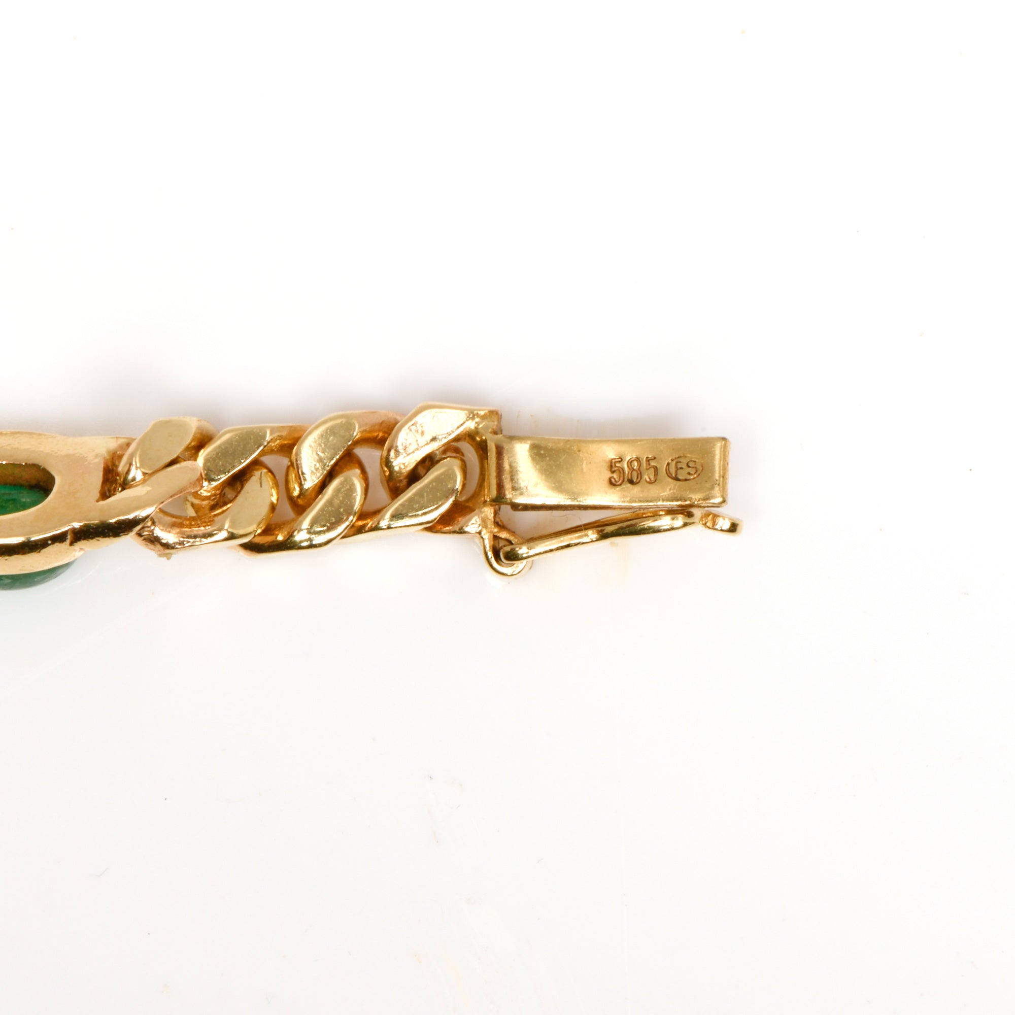 Bei dem Schmuckstück handelt es sich um ein Panzerarmband aus 585 Gelbgold mit fünf Smaragdcabochons. Das Schmuckstück hat eine Gesamtlänge von 18 cm.
