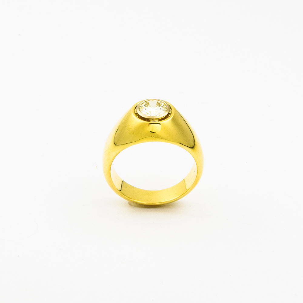 Bei dem Schmuckstück handelt es sich um einen Bandring aus 585 Gelb- und Weißgold mit einem Brillanten von ca. 0,85 ct in der Qualität getönt 3 mit sehr kleinen Einschlüssen (very light yellow/vs 2). Für den Brillanten liegt ein DPL-Gutachten Nr. TP 889 vor.