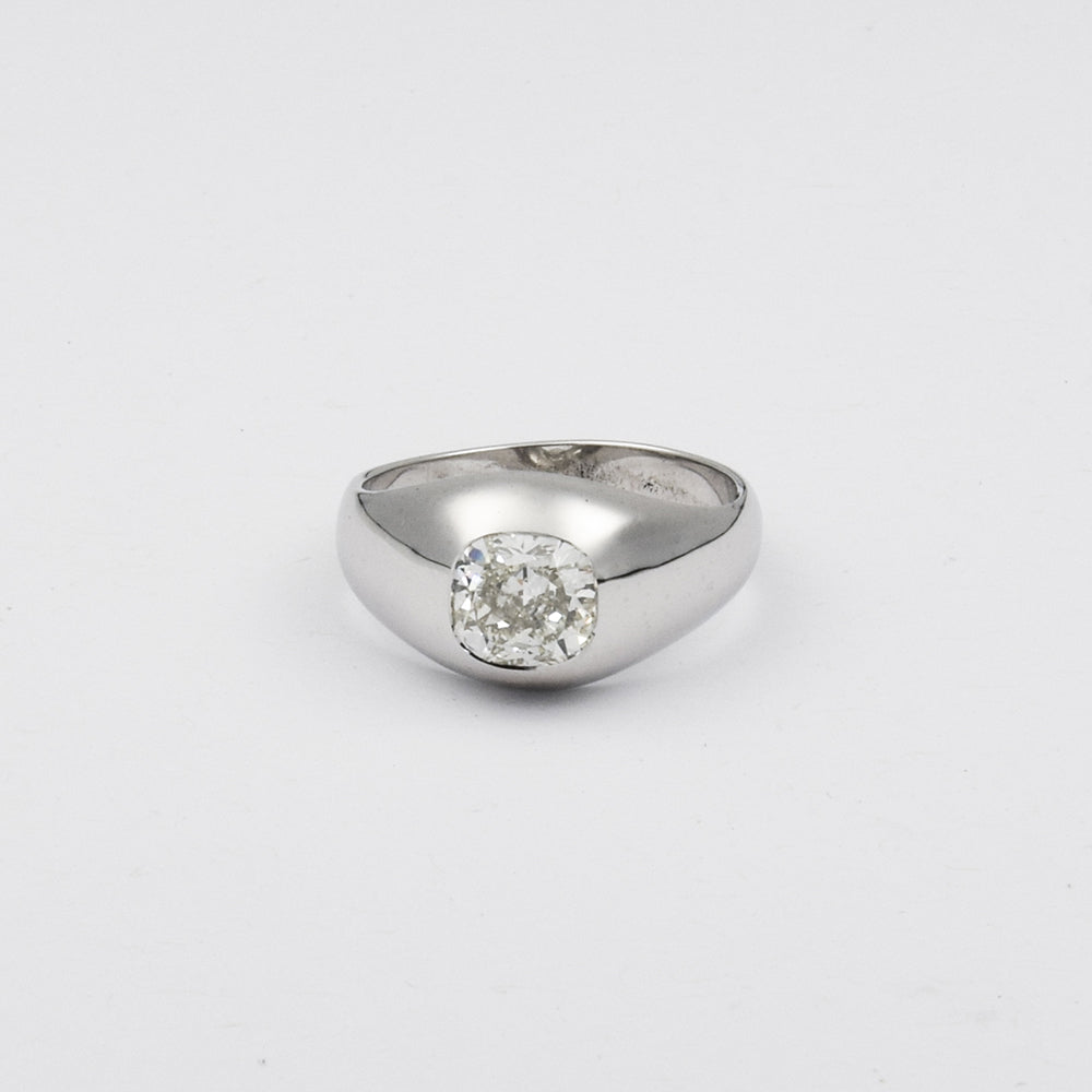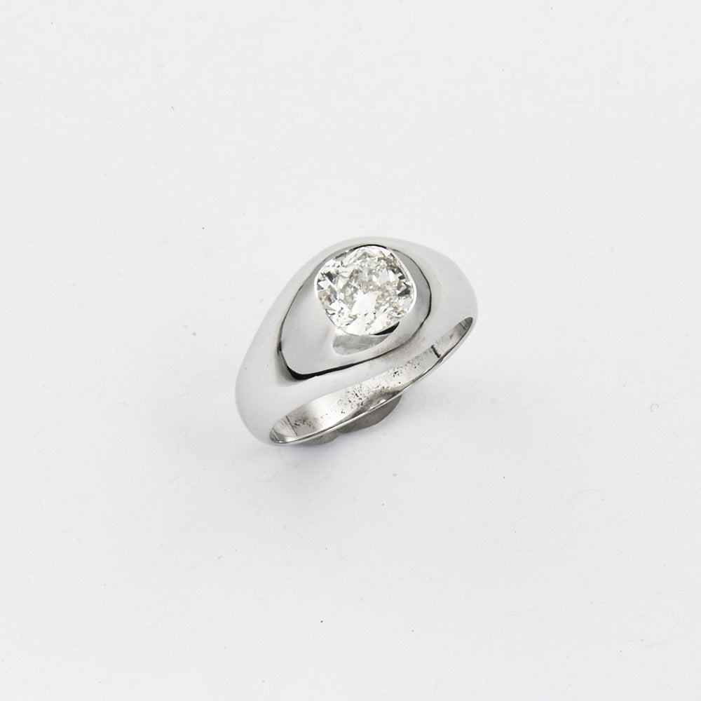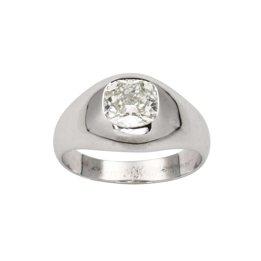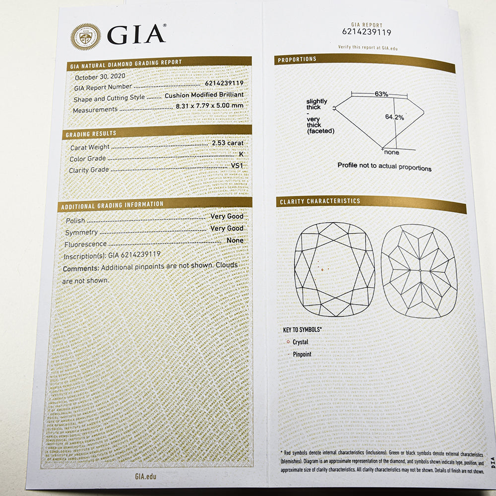 Bei dem Schmuckstück handelt es sich um einen neuwertigen Ring aus 750 Weißgold mit einem Diamanten im Kissenschliff von ca. 2,53 ct in der Qualität getöntes Weiß mit sehr kleinen Einschlüssen (Cr/vs). Für den Diamant liegt eine GIA Expertise vor.