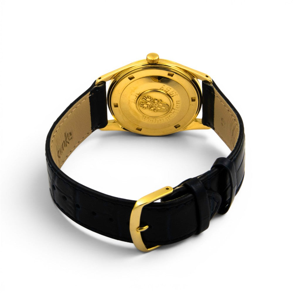 Bei dem Schmuckstück handelt es sich um eine Herrenarmbanduhr der Marke Eterna Modell "Eterna-Matic 3000". Das Material der Uhr ist 750 Gelbgold. Sie besitzt ein Automatikwerk. Es erfolgte eine Revision durch Meisterwerkstatt.