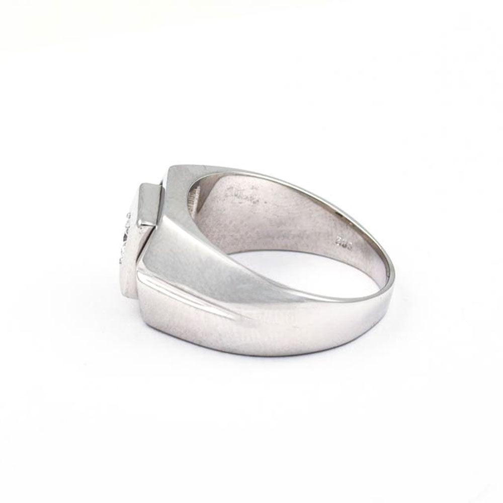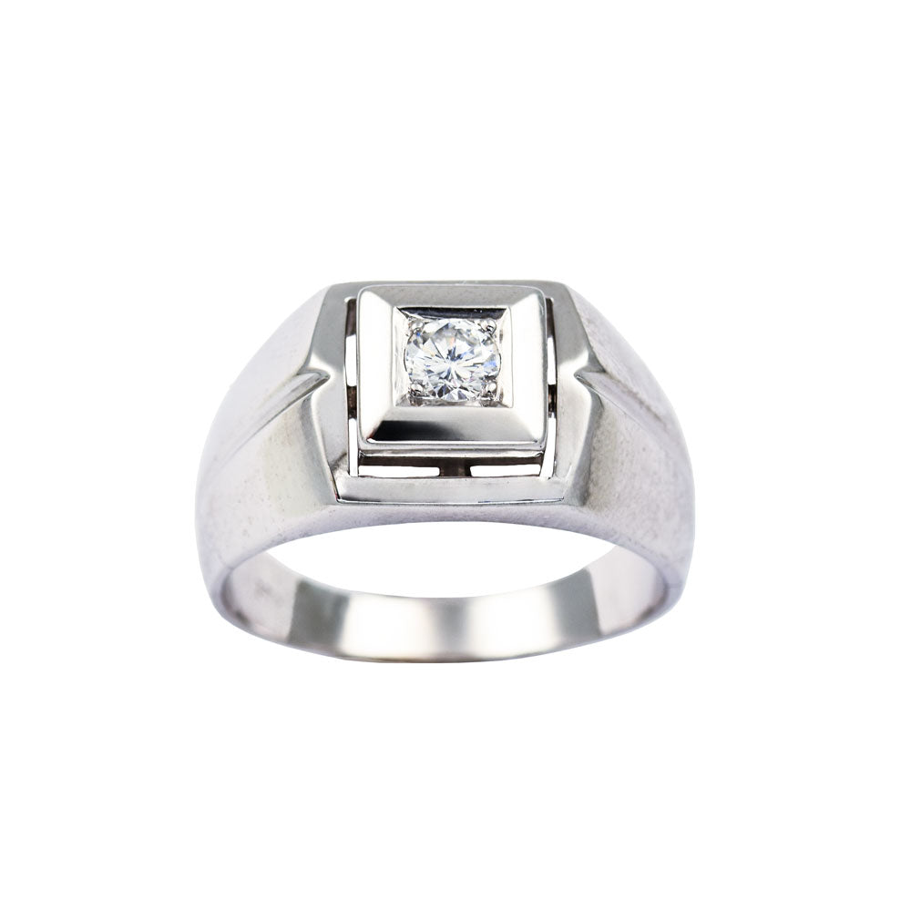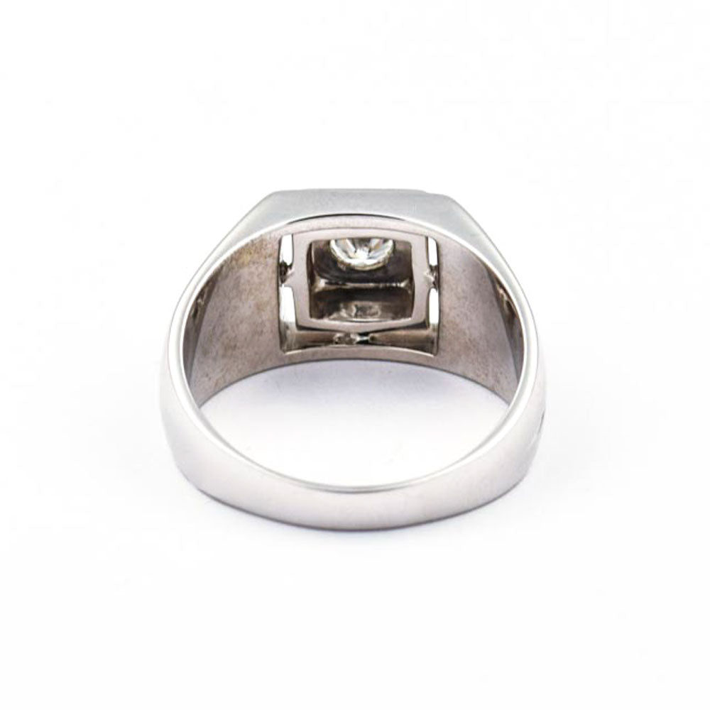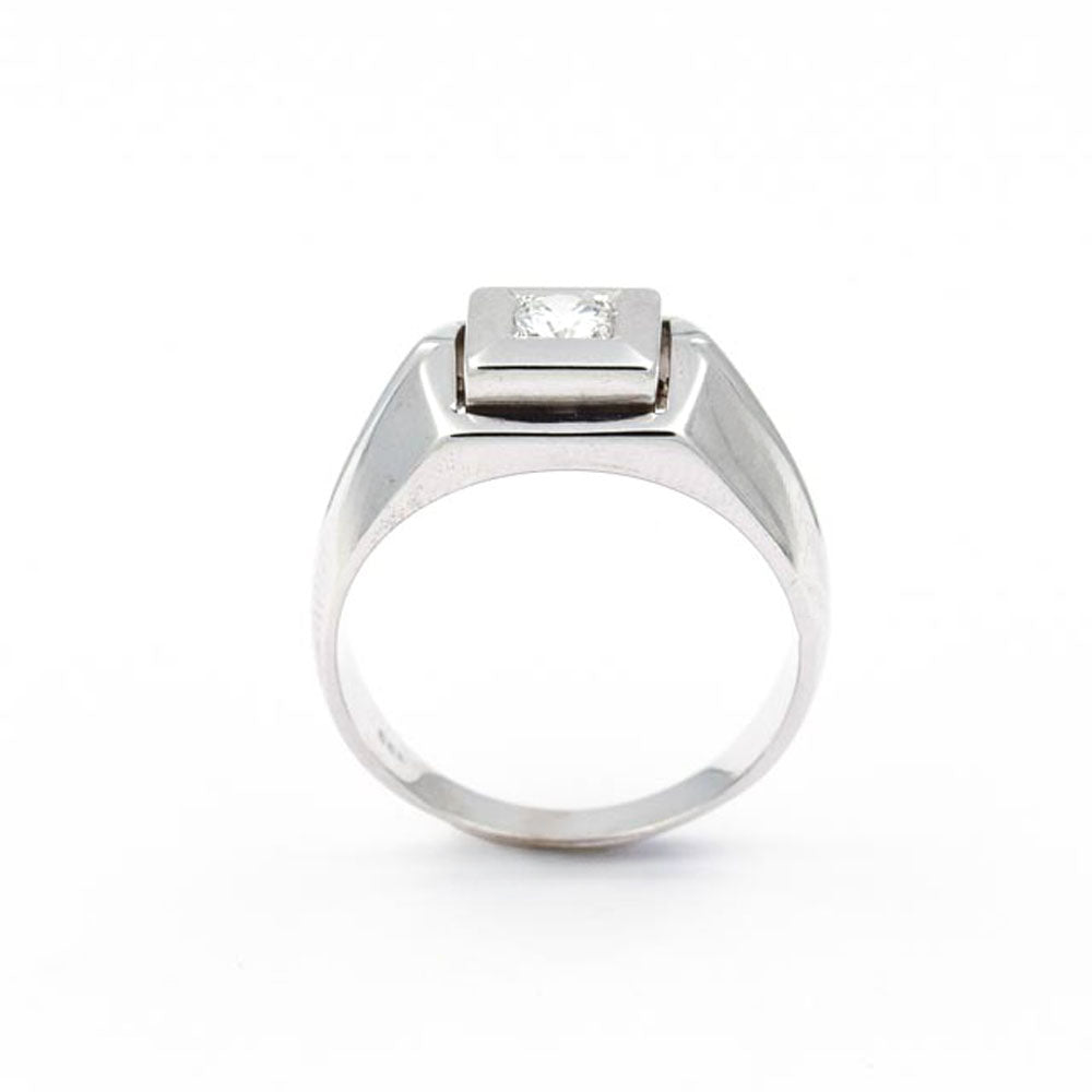 Bei dem Schmuckstück handelt es sich um einen Herrenring aus 585 Weißgold mit einem Brillanten von ca. 0,24 ct in der Qualität feines Weiß mit sehr, sehr kleinen Einschlüssen (TW/vvs).