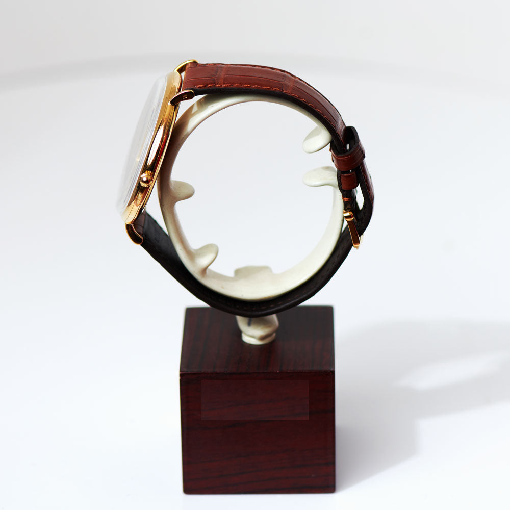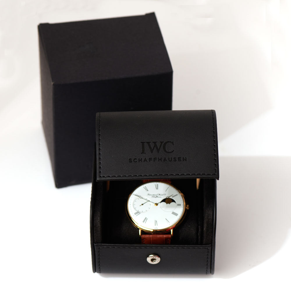 Bei dem Schmuckstück handelt es sich um eine Herrenarmbanduhr der Marke IWC Modell "Portofino" mit der Referenznummer 5251. Das Material der Uhr ist 750 Gelbgold. Sie besitzt ein Handaufzugswerk Kaliber 9521, 17 lig., H 4 mit 19 Steinen. Die Uhr ist mit einer Mondphase ausgestattet und verfügt über eine Breguetspirale, Kleine Sekunde und ist in 5 Positionen reguliert. Die Uhr wurde am 11.05.1982 ausgeliefert. Es erfolgte eine Revision durch IWC. Ein Stammbuchauszug liegt vor.