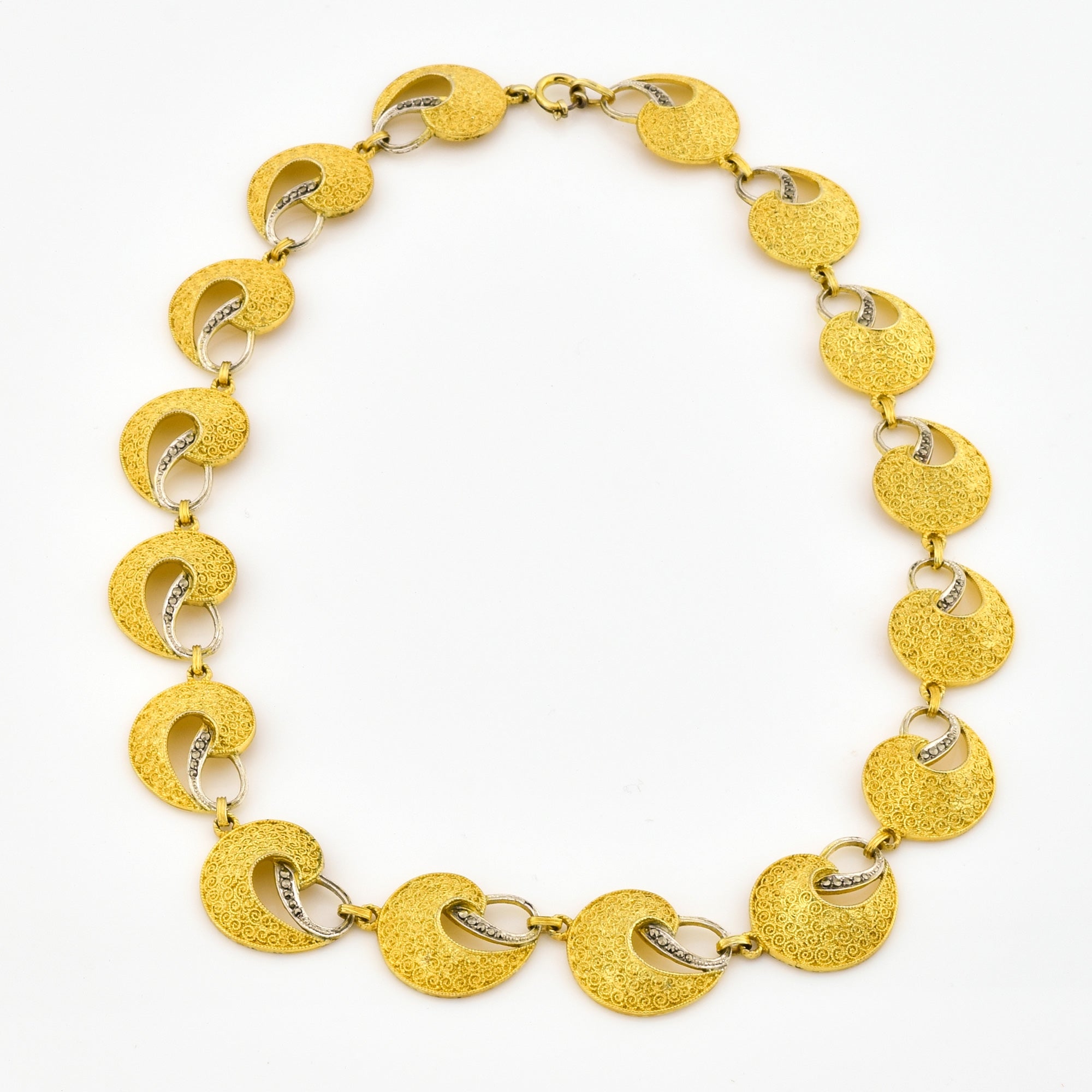 Bei dem Schmuckstück handelt es sich um eine Halskette der Marke Theodor Fahrner aus 925 Silber vergoldet mit 80 Hämatiten. Das Schmuckstück hat eine Gesamtlänge von 41 cm.
