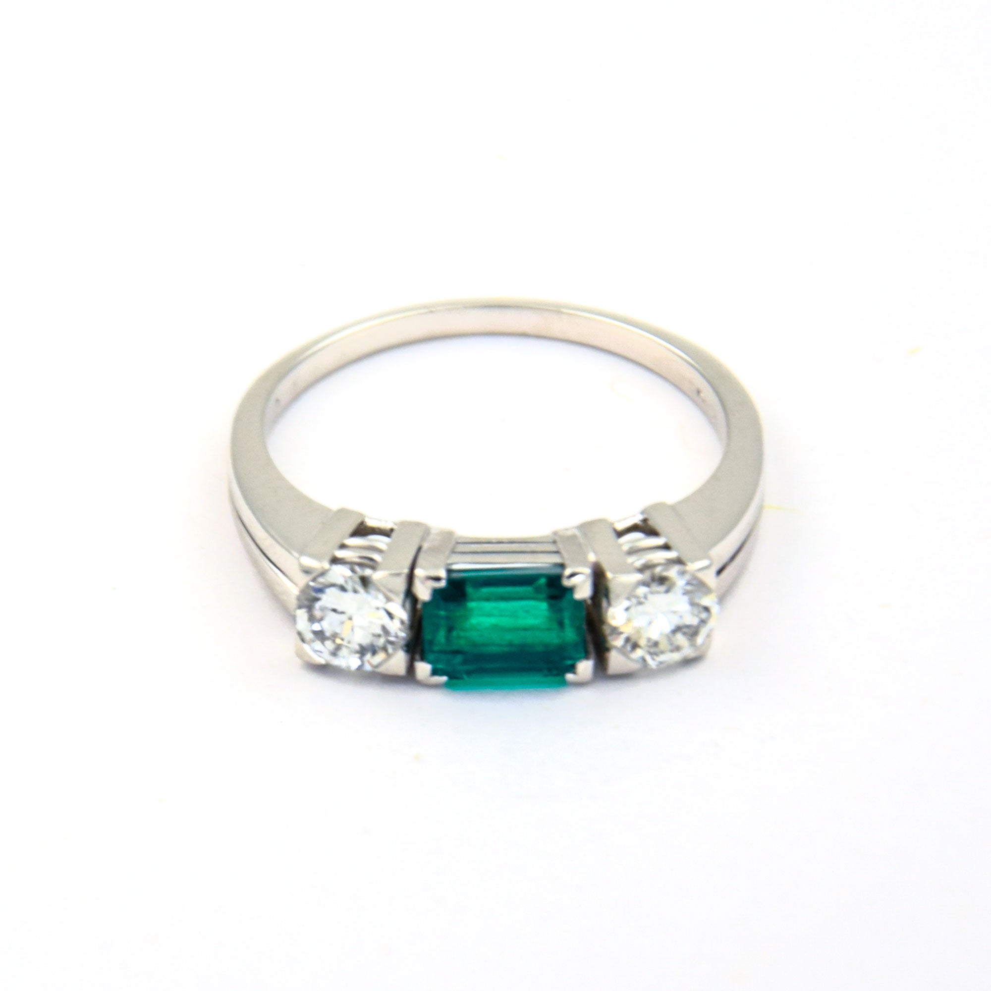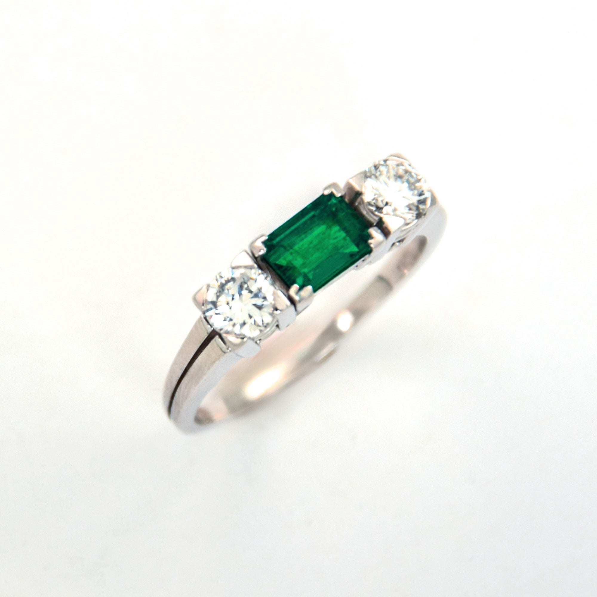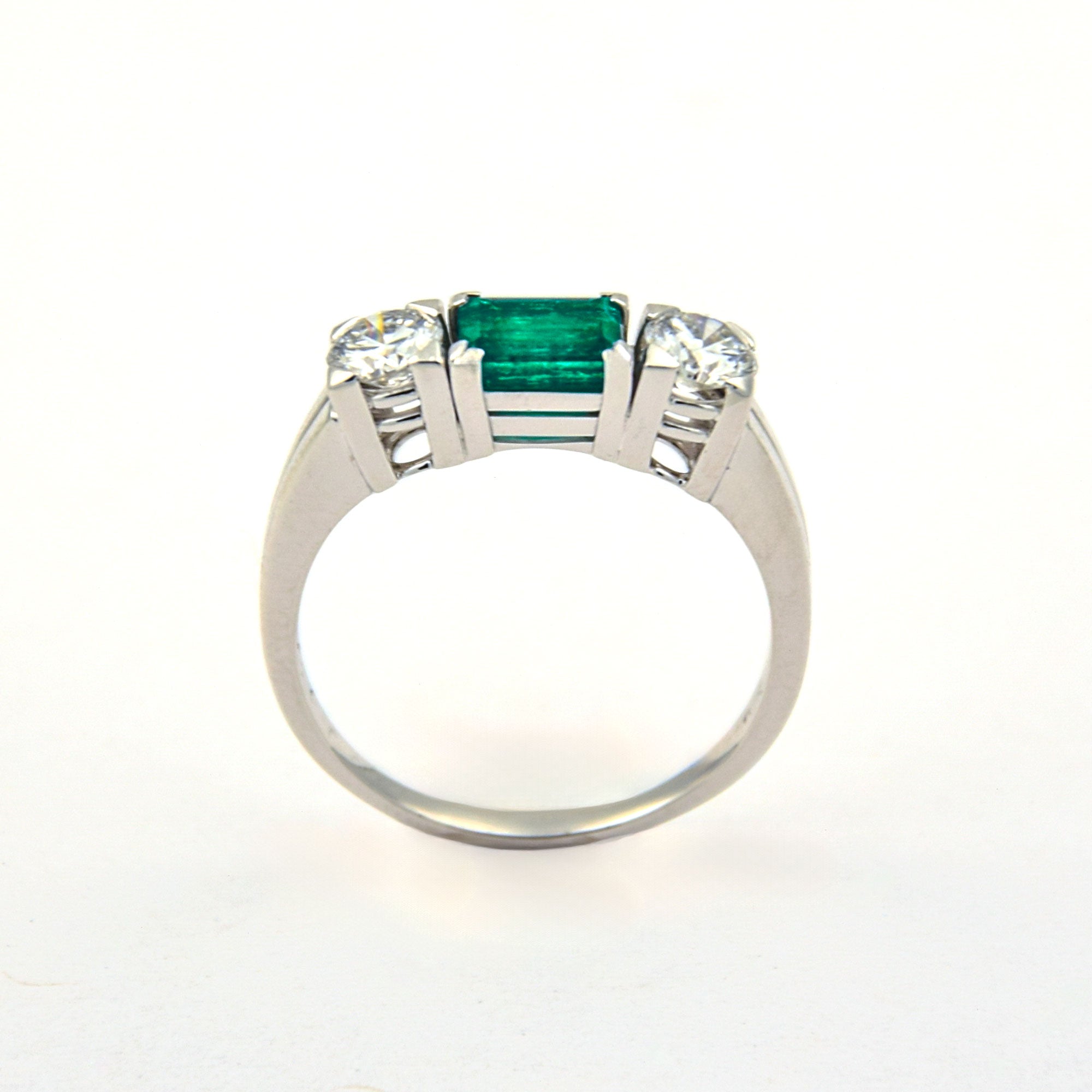Bei dem Schmuckstück handelt es sich um einen Ring von Juwelier Richarz aus 750 Weißgold mit einem Smaragd von ca. 1,12 ct und zwei Brillanten von zusammen ca. 0,8 ct in der Qualität feines Weiß mit sehr, sehr kleinen Einschlüssen (TW/vvs).