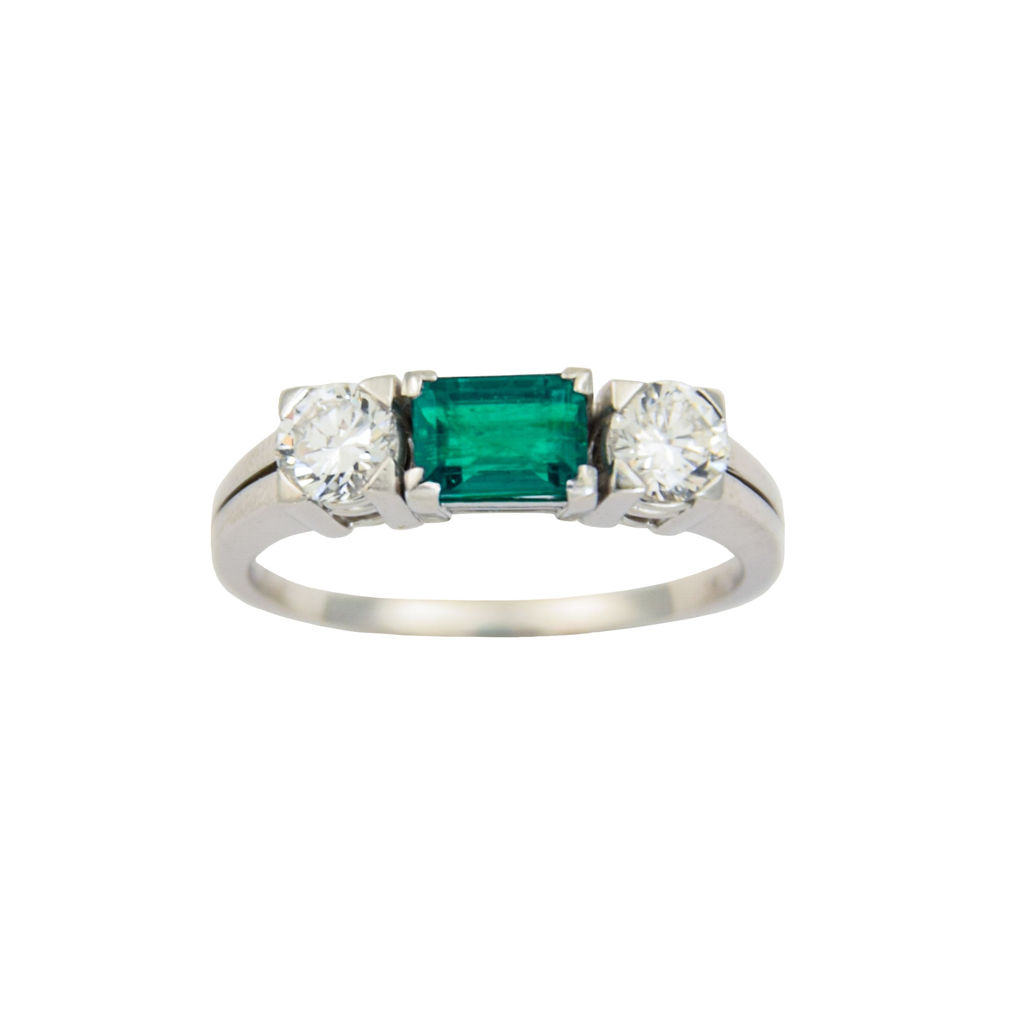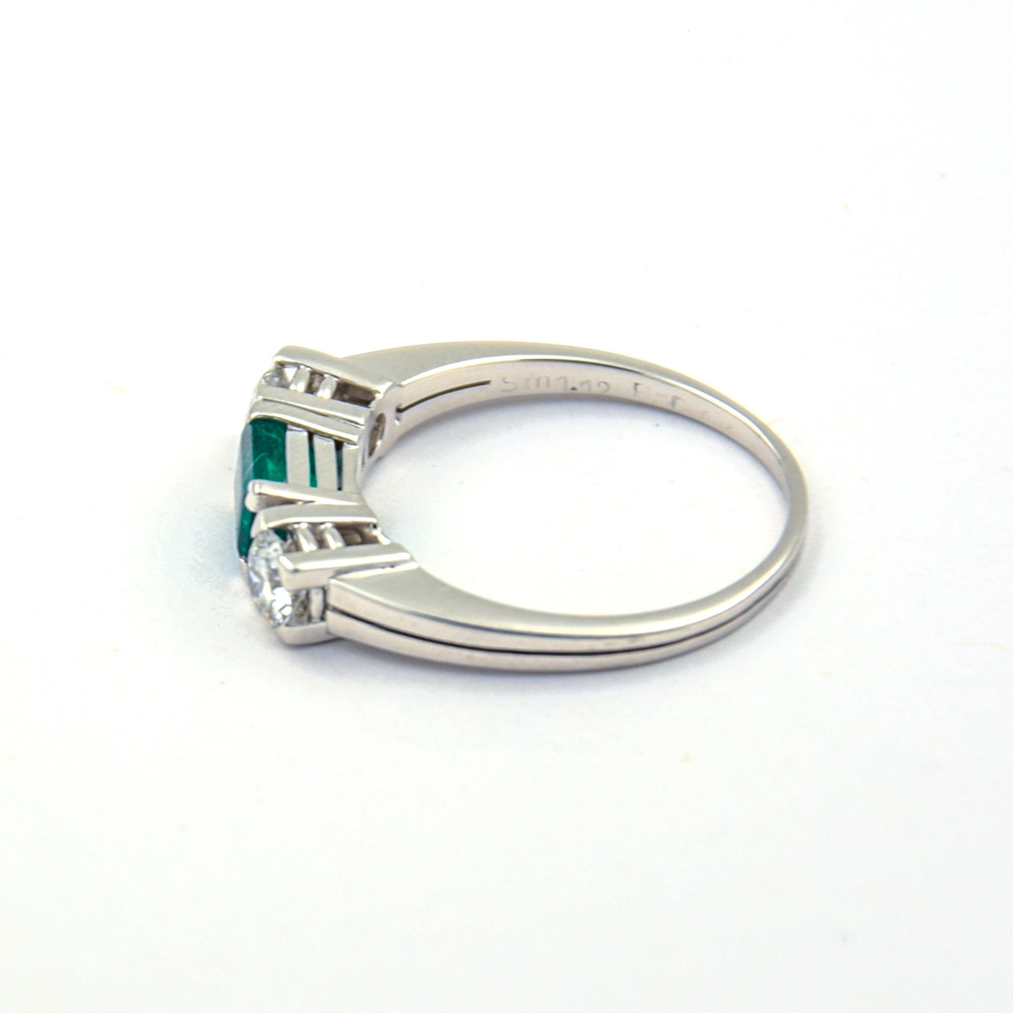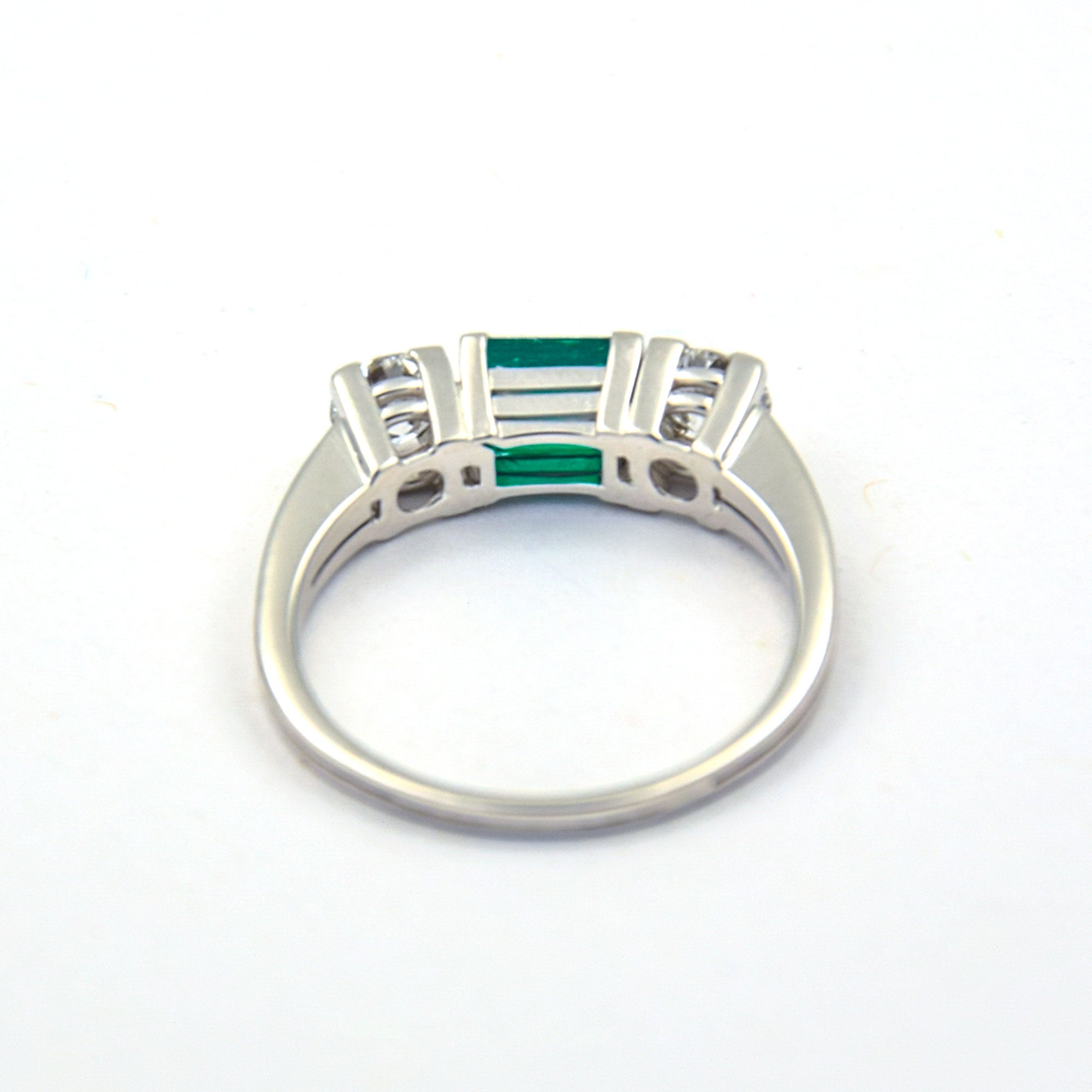 Bei dem Schmuckstück handelt es sich um einen Ring von Juwelier Richarz aus 750 Weißgold mit einem Smaragd von ca. 1,12 ct und zwei Brillanten von zusammen ca. 0,8 ct in der Qualität feines Weiß mit sehr, sehr kleinen Einschlüssen (TW/vvs).