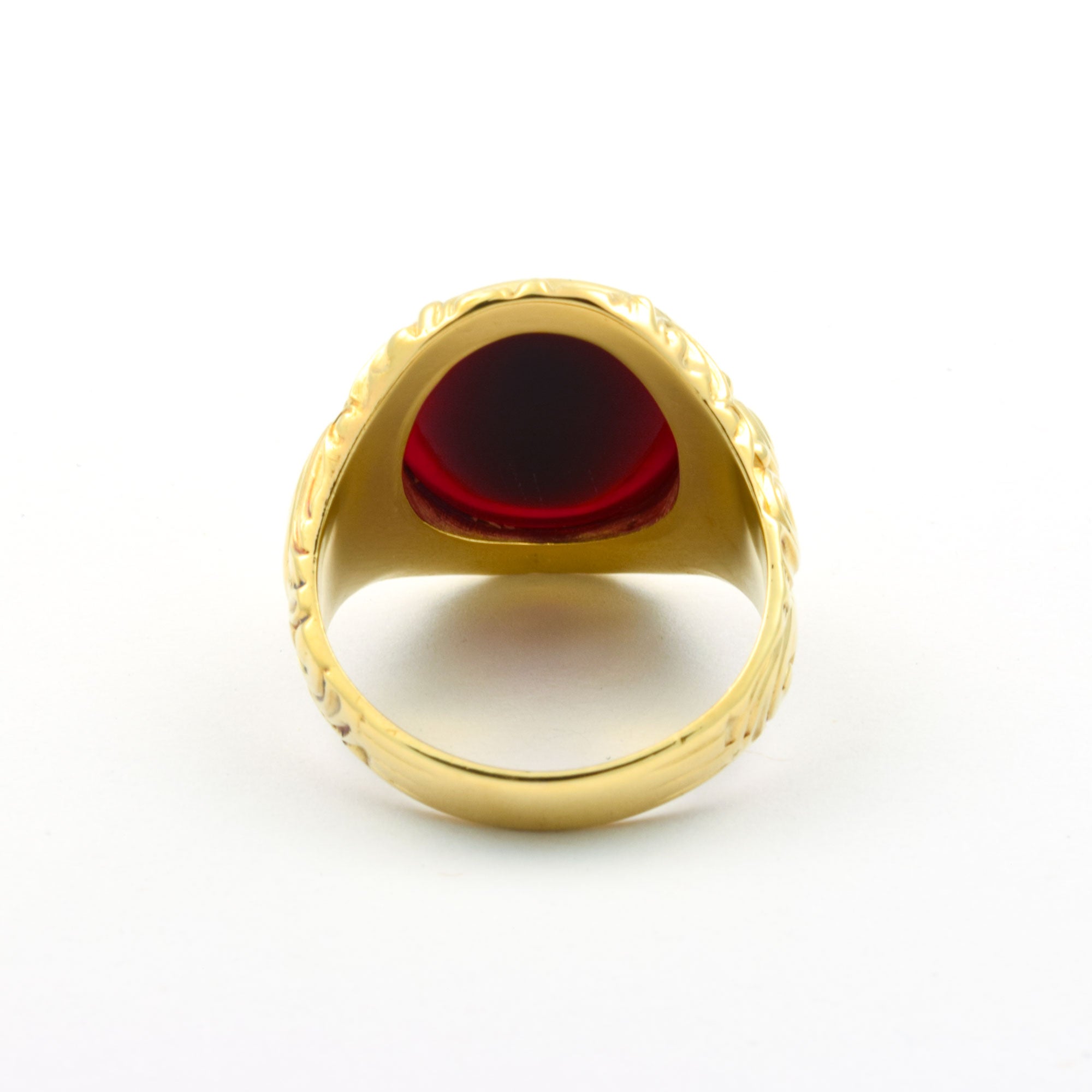 Bei dem Schmuckstück handelt es sich um einen Herrenring aus 585 Gelbgold mit einem Karneol.