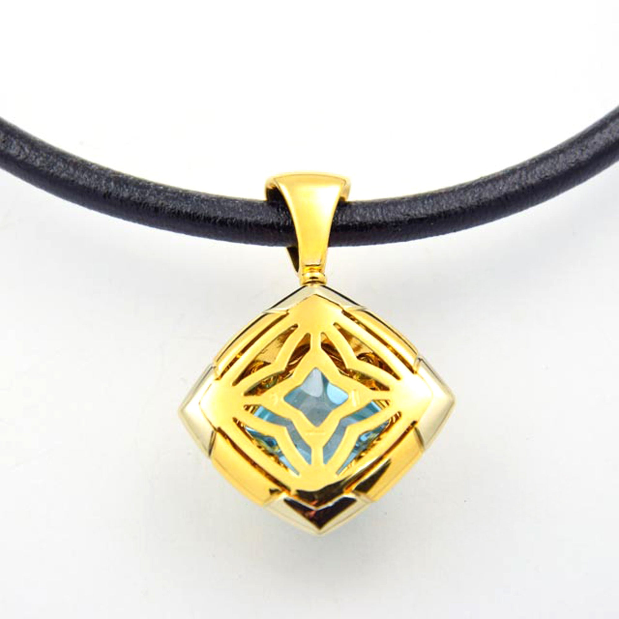 Bei dem Schmuckstück handelt es sich um eine Kette mit Anhänger "Pyramide" der Marke Bulgari aus 750 Gelb- und Weißgold mit einem Topas. Das Schmuckstück hat eine Gesamtlänge von 39,5 cm.